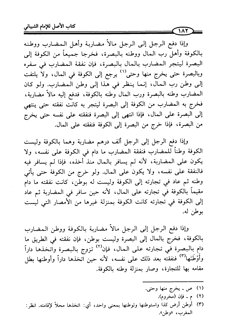 وإذا دفع الرجل إلى الرجل مالاً مضاربة وأهل المضارب ووطنه بالكوفة وأهل رب المال ووطنه بالبصرة، فخرجا جميعاً من الكوفة إلى البصرة ليتجر المضارب بالمال بالبصرة، فإن نفقة المضارب في سفره وبالبصرة حتى يخرج منها وحتى (¬1) يرجع إلى الكوفة في المال، ولا يلتفت إلى وطن رب المال، إنما ينظر في هذا إلى وطن المضارب. ولو كان المضارب وطنه بالبصرة ورب المال وطنه بالكوفة، فدفع إليه مالاً مضاربة، فخرج به المضارب من الكوفة إلى البصرة ليتجر به كانت نفقته حتى ينتهي إلى البصرة على المال، فإذا انتهى إلى البصرة فنفقته على نفسه حتى يخرج من البصرة، فإذا خرج من البصرة إلى الكوفة فنفقته على المال.
