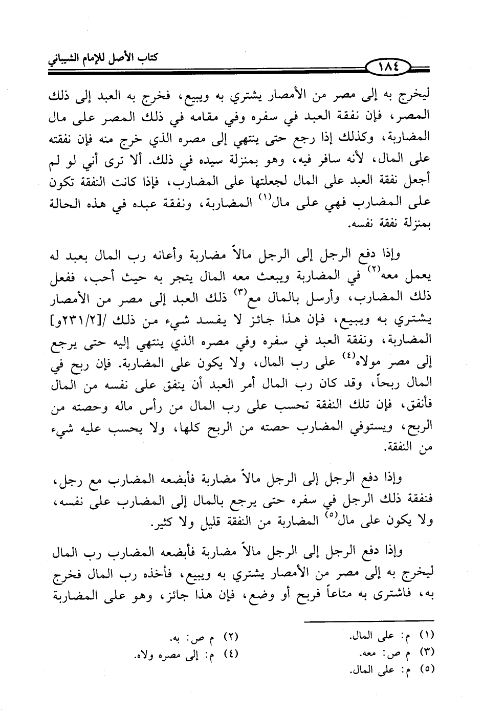 ليخرج به إلى مصر من الأمصار يشتري به ويبيع، فخرج به العبد إلى ذلك المصر، فإن نفقة العبد في سفره وفي مقامه في ذلك المصر على مال المضاربة، وكذلك إذا رجع حتى ينتهي إلى مصره الذي خرج منه فإن نفقته على المال، لأنه سافر فيه، وهو بمنزلة سيده في ذلك. ألا ترى أني لو لم أجعل نفقة العبد على المال لجعلتها على المضارب، فإذا كانت النفقة تكون على المضارب فهي على مال (¬1) المضاربة، ونفقة عبده في هذه الحالة بمنزلة نفقة نفسه.