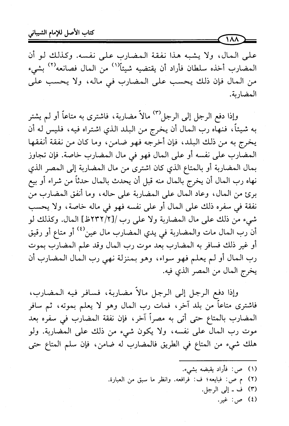 وإذا دفع الرجل إلى الرجل (¬3) مالاً مضاربة، فاشترى به متاعاً أو لم يشتر به شيئاً، فنهاه رب المال أن يخرج من البلد الذي اشتراه فيه، فليس له أن يخرج به من ذلك البلد، فإن أخرجه فهو ضامن، وما كان من نفقة أنفقها المضارب على نفسه أو على المال فهو في مال المضارب خاصة. فإن تجاوز بمال المضاربة أو بالمتاع الذي كان اشترى من مال المضاربة إلى المصر الذي نهاه رب المال أن يخرج بالمال منه قبل أن يحدث بالمال حدثاً من شراء أو بيع برئ من المال، وعاد المال على المضاربة على حاله، وما أنفق المضارب من نفقة في سفره ذلك على المال أو على نفسه فهو في ماله خاصة، ولا يحسب شيء من ذلك على مال المضاربة ولا على رب المال. وكذلك لو أن رب المال مات والمضاربة في يدي المضارب مال عين (¬4) أو متاع أو رقيق أو غير ذلك فسافر به المضارب بعد موت رب المال وقد علم المضارب بموت رب المال أو لم يعلم فهو سواء، وهو بمنزلة نهي رب المال المضارب أن يخرج المال من المصر الذي فيه.