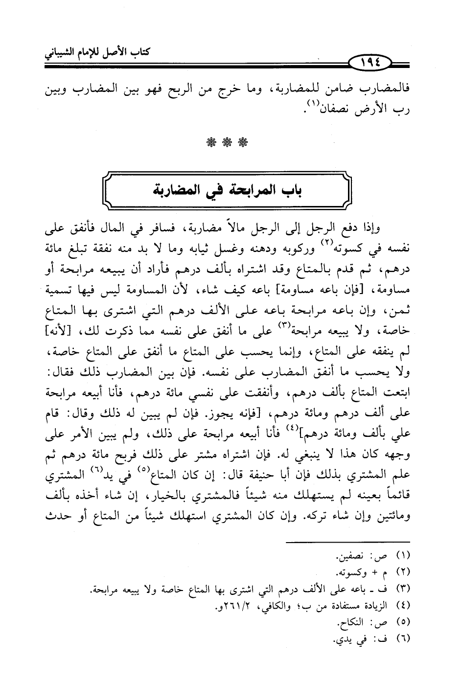 وإذا دفع الرجل إلى الرجل مالاً مضاربة، فسافر في المال فأنفق على نفسه في كسوته (¬2) وركوبه ودهنه وغسل ثيابه وما لا بد منه نفقة تبلغ مائة درهم، ثم قدم بالمتاع وقد اشتراه بألف درهم فأراد أن يبيعه مرابحة أو مساومة، [فإن باعه مساومة] باعه كيف شاء، لأن المساومة ليس فيها تسمية ثمن، وإن باعه مرابحة باعه على الألف درهم التي اشترى بها المتاع خاصة، ولا يبيعه مرابحة (¬3) على ما أنفق على نفسه مما ذكرت لك، [لأنه] لم ينفقه على المتاع، وإنما يحسب على المتاع ما أنفق على المتاع خاصة، ولا يحسب ما أنفق المضارب على نفسه. فإن بين المضارب ذلك فقال: ابتعت المتاع بألف درهم، وأنفقت على نفسي مائة درهم، فأنا أبيعه مرابحة على ألف درهم ومائة درهم، [فإنه يجوز. فإن لم يبين له ذلك وقال: قام علي بألف ومائة درهم] (¬4) فأنا أبيعه مرابحة على ذلك، ولم يبين الأمر على وجهه كان هذا لا ينبغي له. فإن اشتراه مشتر على ذلك فربح مائة درهم ثم علم المشتري بذلك فإن أبا حنيفة قال: إن كان المتاع (¬5) في يد (¬6) المشتري قائماً بعينه لم يستهلك منه شيئاً فالمشتري بالخيار، إن شاء أخذه بألف ومائتين وإن شاء تركه. وإن كان المشتري استهلك شيئاً من المتاع أو حدث