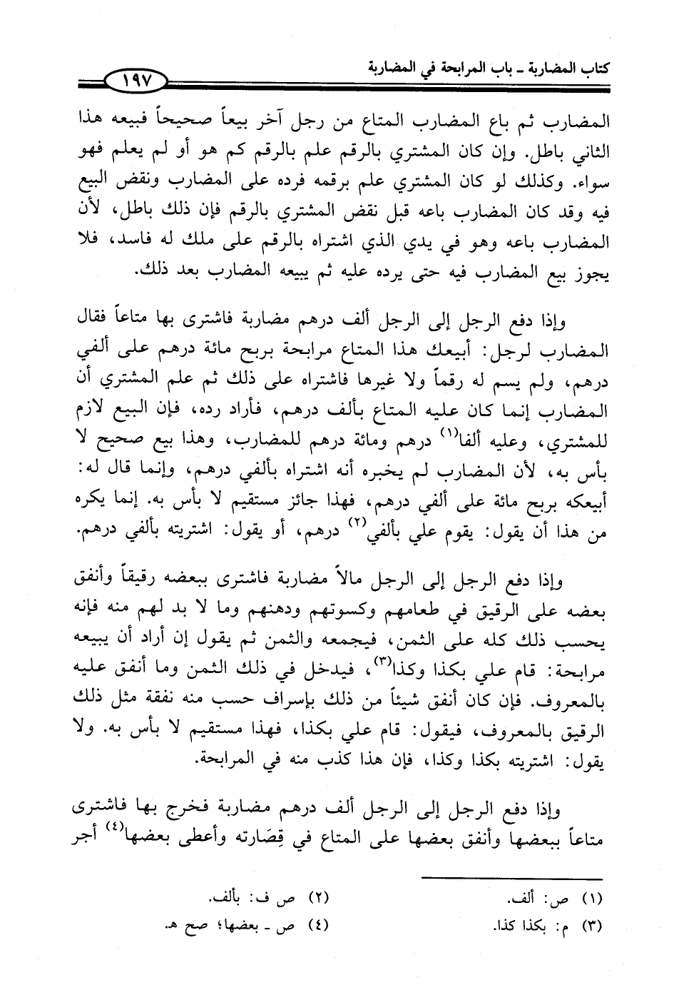 وإذا دفع الرجل إلى الرجل مالاً مضاربة فاشترى ببعضه رقيقاً وأنفق بعضه على الرقيق في طعامهم وكسوتهم ودهنهم وما لا بد لهم منه فإنه يحسب ذلك كله على الثمن، فيجمعه والثمن ثم يقول إن أراد أن يبيعه مرابحة: قام علي بكذا وكذا (¬3)، فيدخل في ذلك الثمن وما أنفق عليه بالمعروف. فإن كان أنفق شيئاً من ذلك بإسراف حسب منه نفقة مثل ذلك الرقيق بالمعروف، فيقول: قام علي بكذا، فهذا مستقيم لا بأس به. ولا يقول: اشتريته بكذا وكذا، فإن هذا كذب منه في المرابحة.