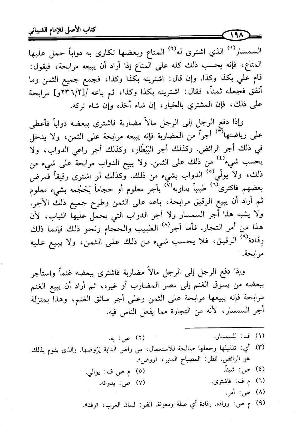 وإذا دفع الرجل إلى الرجل مالاً مضاربة فاشترى ببعضه دواباً فأعطى على رياضتها (¬3) أجراً من المضاربة فإنه يبيعه مرابحة على الثمن، ولا يدخل في ذلك أجر الرائض. وكذلك أجر البَيْطَار، وكذلك أجر راعي الدواب، ولا يحسب شيء (¬4) من ذلك على الثمن. ولا يبيع الدواب مرابحة على شيء من ذلك، ولا يولّي (¬5) الدواب بشيء من ذلك. وكذلك لو اشترى رقيقاً فمرض بعضهم فاكترى (¬6) طبيباً يداويه (¬7) بأجر معلوم أو حجاماً يَحْجُمه بشيء معلوم ثم أراد أن يبيع الرقيق مرابحة، باعه على الثمن وطرح جميع ذلك الأجر. ولا يشبه هذا أجر السمسار ولا أجر الدواب التي يحمل عليها الثياب، لأن هذا من أمر التجار. فأما أجر (¬8) الطبيب والحجام ونحو ذلك فإنما ذلك رِفَادة (¬9) الرقيق، فلا يحسب شيء من ذلك على الثمن، ولا يبيع عليه مرابحة.