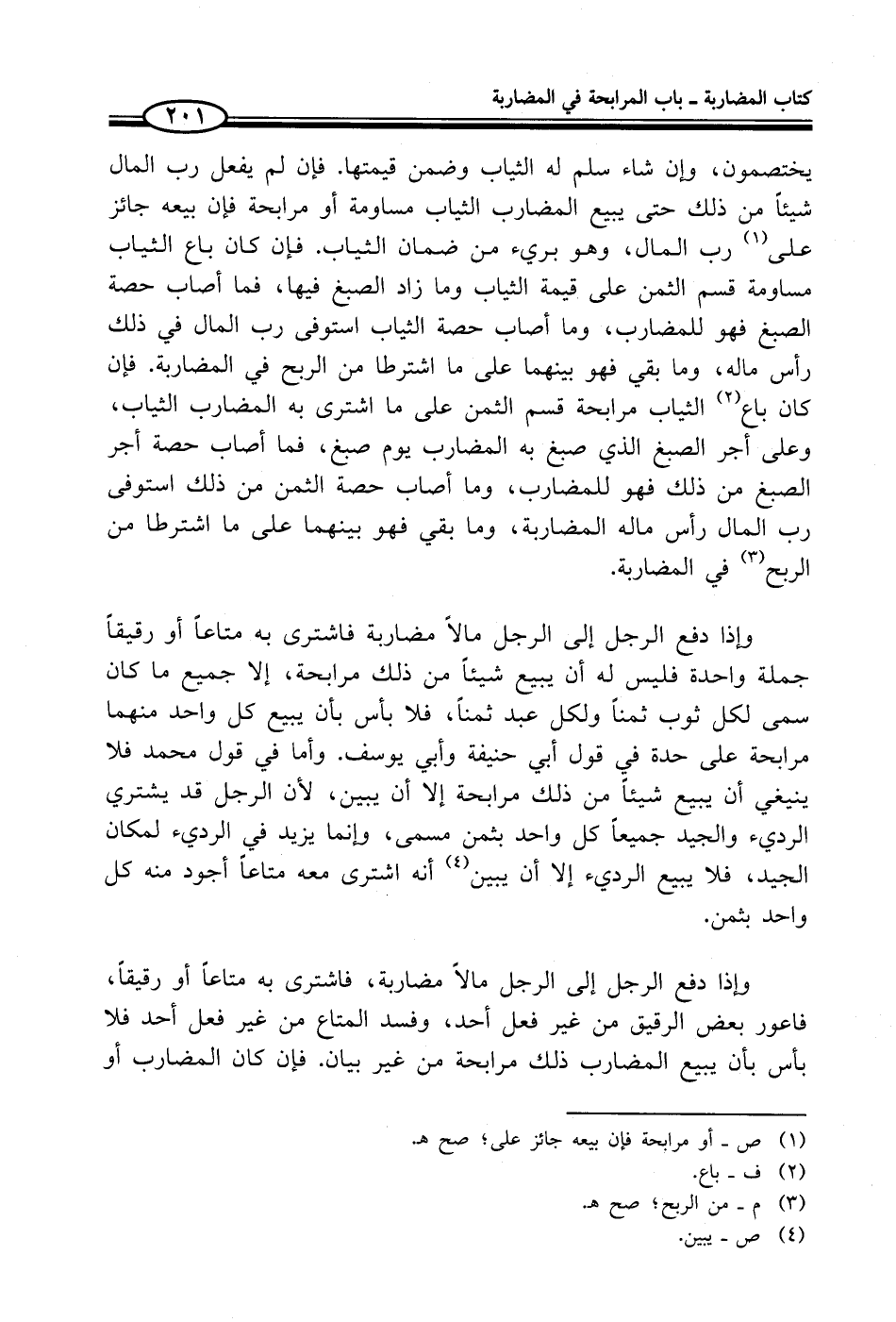 وإذا دفع الرجل إلى الرجل مالاً مضاربة فاشترى به متاعاً أو رقيقاً جملة واحدة فليس له أن يبيع شيئاً من ذلك مرابحة، إلا جميع ما كان سمى لكل ثوب ثمناً ولكل عبد ثمناً، فلا بأس بأن يبيع كل واحد منهما مرابحة على حدة في قول أبي حنيفة وأبي يوسف. وأما في قول محمد فلا ينيغي أن يبيع شيئاً من ذلك مرابحة إلا أن يبين، لأن الرجل قد يشتري الرديء والجيد جميعاً كل واحد بثمن مسمى، وإنما يزيد في الرديء لمكان الجيد، فلا يبيع الرديء إلا أن يبين (¬4) أنه اشترى معه متاعاً أجود منه كل واحد بثمن.