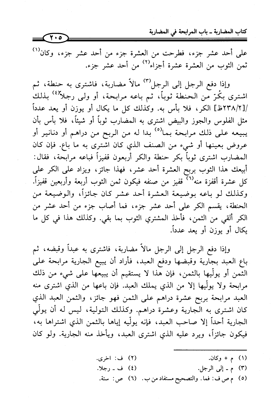 وإذا دفع الرجل إلى الرجل (¬3) مالاً مضاربة، فاشترى به حنطة، ثم اشترى بكُرّ من الحنطة ثوباً، ثم باعه مرابحة، أو ولى رجلاً (¬4) بذلك الكر، فلا بأس به. وكذلك كل ما يكال أو يوزن أو يعد عدداً مثل الفلوس والجوز والبيض اشترى به المضارب ثوباً أو شيئاً، فلا بأس بأن يبيعه على ذلك مرابحة بما (¬5) بدا له من الربح من دراهم أو دنانير أو عروض بعينها أو شيء من الصنف الذي كان اشترى به ما باع. فإن كان المضارب اشترى ثوباً بكر حنطة والكر أربعون قفيزاً فباعه مرابحة، فقال: أبيعك هذا الثوب بربح العشرة أحد عشر، فهذا جائز، ويزاد على الكر على كل عشرة أقفزة منه (¬6) قفيز من صنفه فيكون ثمن الثوب أربعة وأربعين قفيزاً. وكذلك لو باعه بوضيعة العشرة أحد عشر كان جائزاً، والوضيعة من الحنطة، يقسم الكر على أحد عشر جزء، فما أصاب جزء من أحد عشر من الكر ألقي من الثمن، فأخذ المشتري الثوب بما بقي. وكذلك هذا في كل ما يكال أو يوزن أو يعد عدداً.