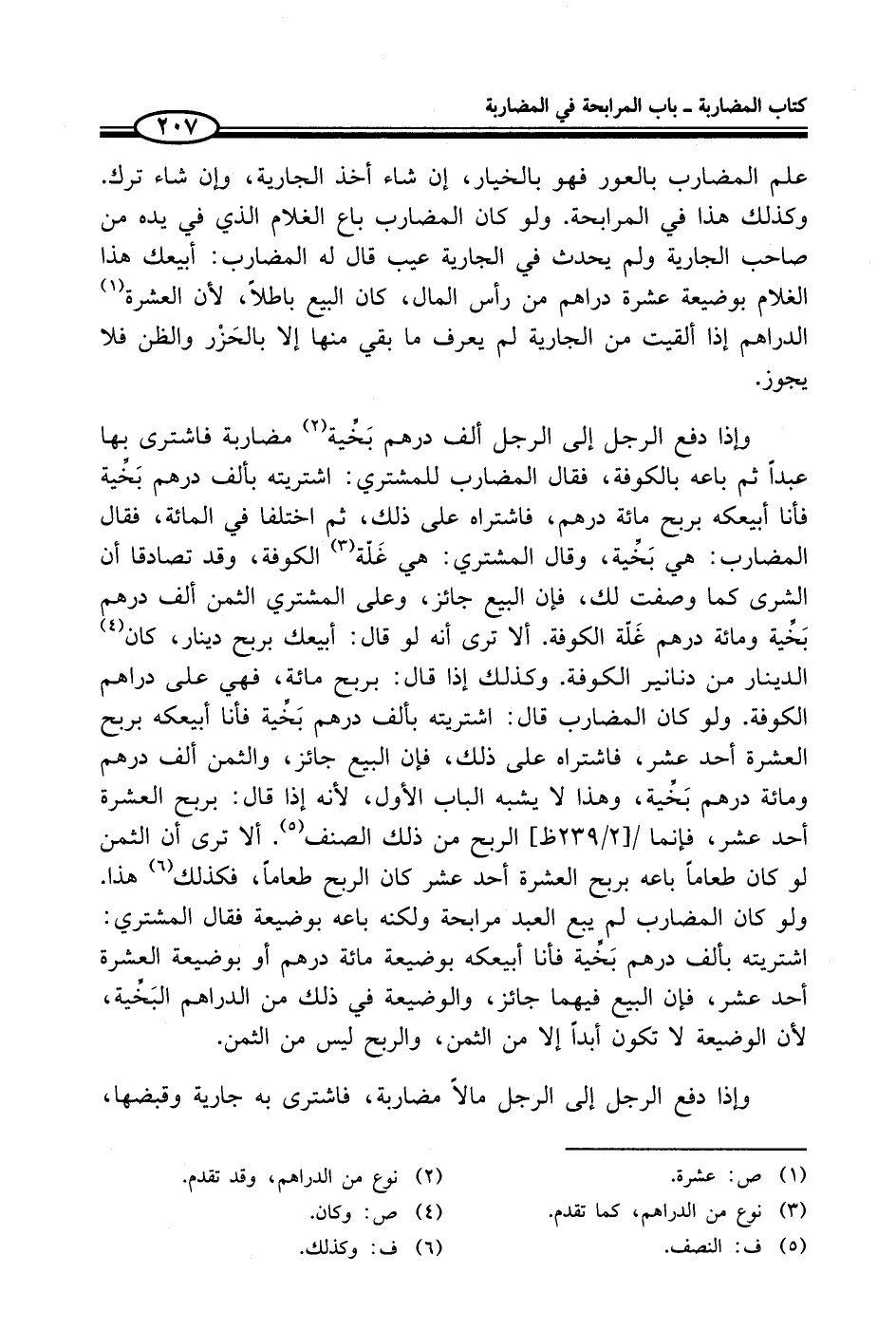 علم المضارب بالعور فهو بالخيار، إن شاء أخذ الجارية، وإن شاء ترك. وكذلك هذا في المرابحة. ولو كان المضارب باع الغلام الذي في يده من صاحب الجارية ولم يحدث في الجارية عيب قال له المضارب: أبيعك هذا الغلام بوضيعة عشرة دراهم من رأس المال، كان البيع باطلاً، لأن العشرة (¬1) الدراهم إذا ألقيت من الجارية لم يعرف ما بقي منها إلا بالحَزْر والظن فلا يجوز.