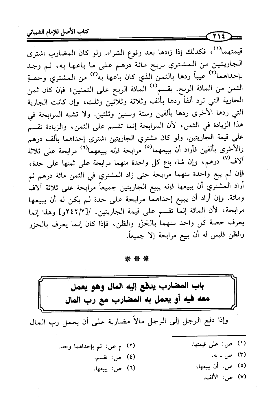 قيمتهما (¬1)، فكذلك إذا زادها بعد وقوع الشراء. ولو كان المضارب اشترى الجاريتين من المشتري بربح مائة درهم على ما باعها به، ثم وجد بإحداهما (¬2) عيباً ردها بالثمن الذي كان باعها به (¬3) من المشتري وحصةِ الثمن من المائة الربح. يقسم (¬4) المائة الربح على الثمنين؛ فإن كان ثمن الجارية التي ترد ألفاً ردها بألف وثلاثة وثلاثين وثلث، وإن كانت الجارية التي ردها الأخرى ردها بألفين وستة وستين وثلثين. ولا تشبه المرابحة في هذا الزيادة في الثمن، لأن المرابحة إنما تقسم على الثمن، والزيادة تقسم على قيمة الجاريتين. ولو كان مشتري الجاريتين اشترى إحداهما بألف درهم والأخرى بألفين فأراد أن يبيعهما (¬5) مرابحة فإنه يبيعهما (¬6) مرابحة على ثلاثة آلاف (¬7) درهم، وإن شاء باع كل واحدة منهما مرابحة على ثمنها على حدة، فإن لم يبع واحدة منهما مرابحة حتى زاد المشتري في الثمن مائة درهم ثم أراد المشتري أن يبيعها فإنه يبيع الجاريتين جميعاً مرابحة على ثلاثة آلاف ومائة. وإن أراد أن يبيع إحداهما مرابحة على حدة لم يكن له أن يبيعها مرابحة، لأن المائة إنما تقسم على قيمة الجاريتين. وهذا إنما يعرف حصة كل واحد منهما بالحَزْر والظن، فإذا كان إنما يعرف بالحزر والظن فليس له أن يبيع مرابحة إلا جميعاً.
