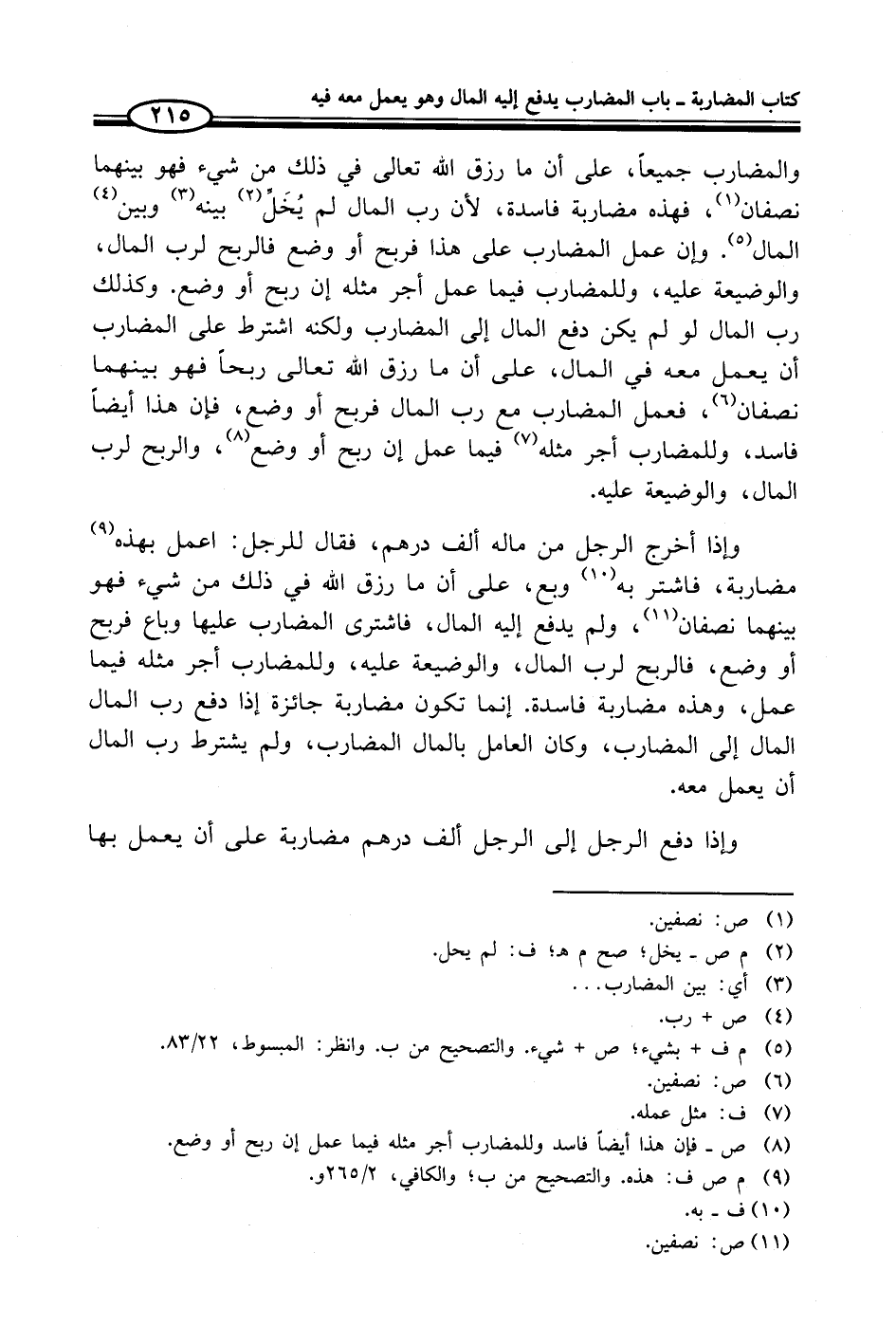والمضارب جميعاً، على أن ما رزق الله تعالى في ذلك من شيء فهو بينهما نصفان (¬1)، فهذه مضاربة فاسدة، لأن رب المال لم يُخَلِّ (¬2) بينه (¬3) وبين (¬4) المال (¬5). وإن عمل المضارب على هذا فربح أو وضع فالربح لرب المال، والوضيعة عليه، وللمضارب فيما عمل أجر مثله إن ربح أو وضع. وكذلك رب المال لو لم يكن دفع المال إلى المضارب ولكنه اشترط على المضارب أن يعمل معه في المال، على أن ما رزق الله تعالى ربحاً فهو بينهما نصفان (¬6)، فعمل المضارب مع رب المال فربح أو وضع، فإن هذا أيضاً فاسد، وللمضارب أجر مثله (¬7) فيما عمل إن ربح أو وضع (¬8)، والربح لرب المال، والوضيعة عليه.