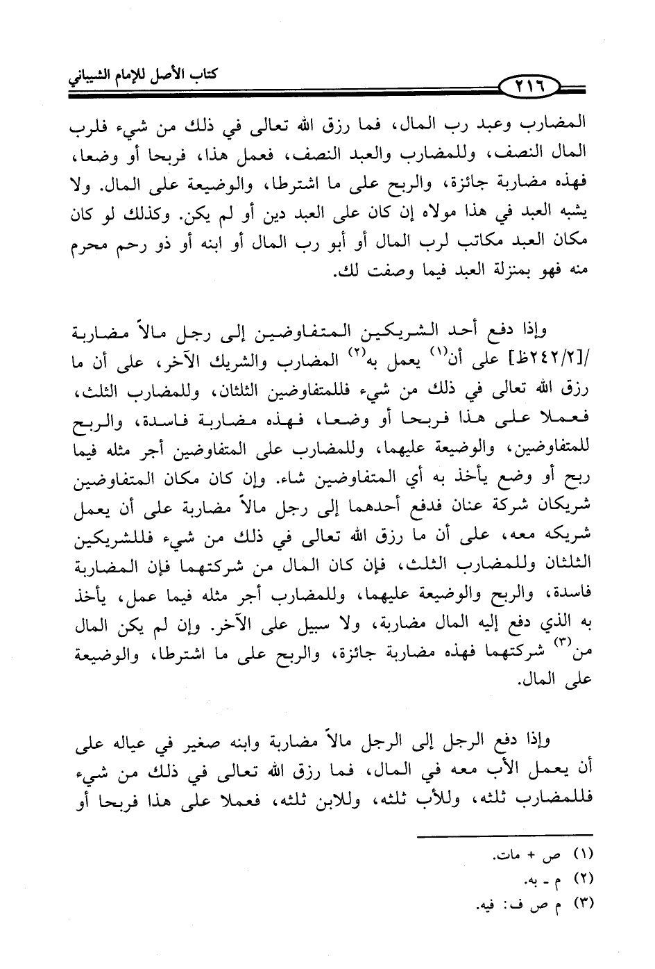 وإذا دفع أحد الشريكين المتفاوضين إلى رجل مالاً مضاربة على أن (¬1) يعمل به (¬2) المضارب والشريك الآخر، على أن ما رزق الله تعالى في ذلك من شيء فللمتفاوضين الثلثان، وللمضارب الثلث، فعملا على هذا فربحا أو وضعا، فهذه مضاربة فاسدة، والربح للمتفاوضين، والوضيعة عليهما، وللمضارب على المتفاوضين أجر مثله فيما ربح أو وضع يأخذ به أي المتفاوضين شاء. وإن كان مكان المتفاوضين شريكان شركة عنان فدفع أحدهما إلى رجل مالاً مضاربة على أن يعمل شريكه معه، على أن ما رزق الله تعالى في ذلك من شيء فللشريكين الثلثان وللمضارب الثلث، فإن كان المال من شركتهما فإن المضاربة فاسدة، والربح والوضيعة عليهما، وللمضارب أجر مثله فيما عمل، يأخذ به الذي دفع إليه المال مضاربة، ولا سبيل على الآخر. وإن لم يكن المال من (¬3) شركتهما فهذه مضاربة جائزة، والربح على ما اشترطا، والوضيعة على المال.