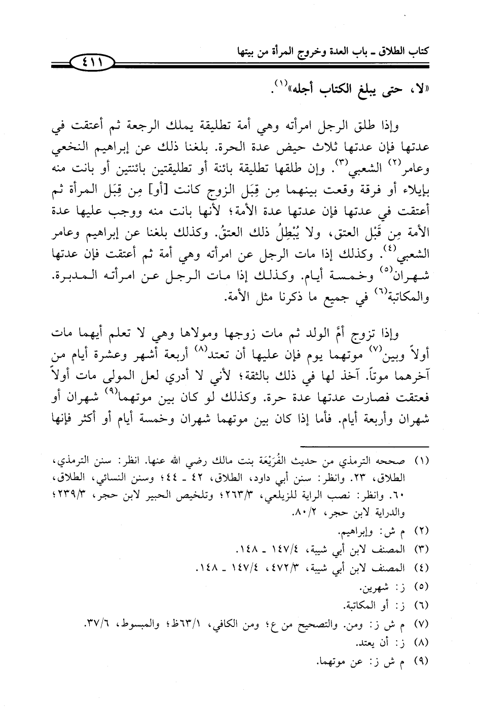 (¬1) صححه الترمذي من حديث الفُرَيْعَة بنت مالك - رضي الله عنها -. انظر: سنن الترمذي، الطلاق، 23. وانظر: سنن أبي داود، الطلاق، 42 - 44؛ وسنن النسائي، الطلاق، 60. وانظر: نصب الراية للزيلعي، 3/ 263؛ وتلخيص الحبير لابن حجر، 3/ 239؛ والدراية لابن حجر، 2/ 80.