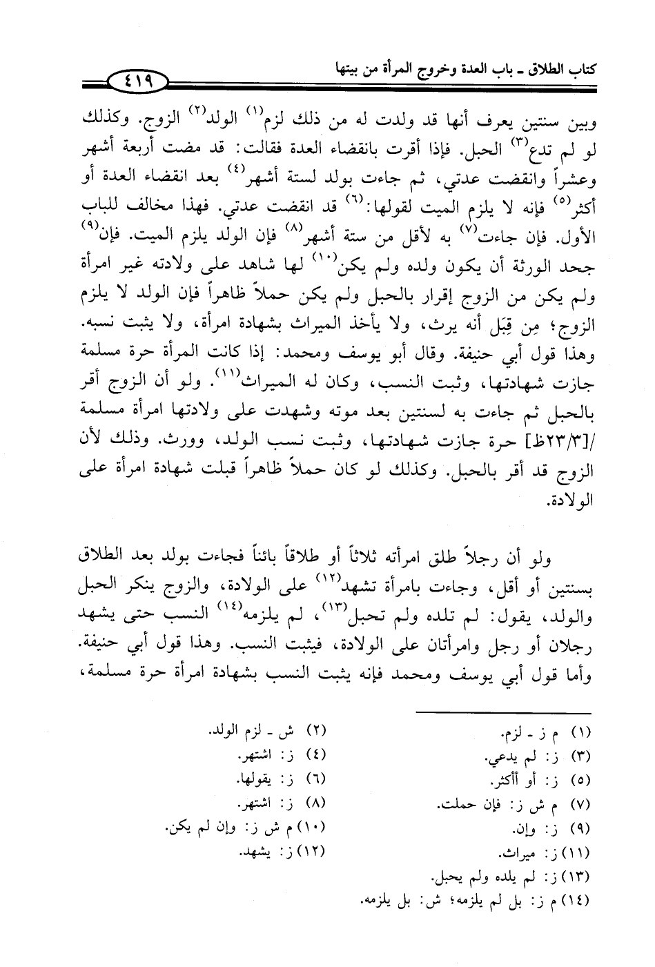 ولو أن رجلاً طلق امرأته ثلاثاً أو طلاقاً بائناً فجاءت بولد بعد الطلاق بسنتين أو أقل، وجاءت بامرأة تشهد (¬12) على الولادة، والزوج ينكر الحبل والولد، يقول: لم تلده ولم تحبل (¬13)، لم يلزمه (¬14) النسب حتى يشهد رجلان أو رجل وامرأتان على الولادة، فيثبت النسب. وهذا قول أبي حنيفة. وأما قول أبي يوسف ومحمد فإنه يثبت النسب بشهادة امرأة حرة مسلمة،