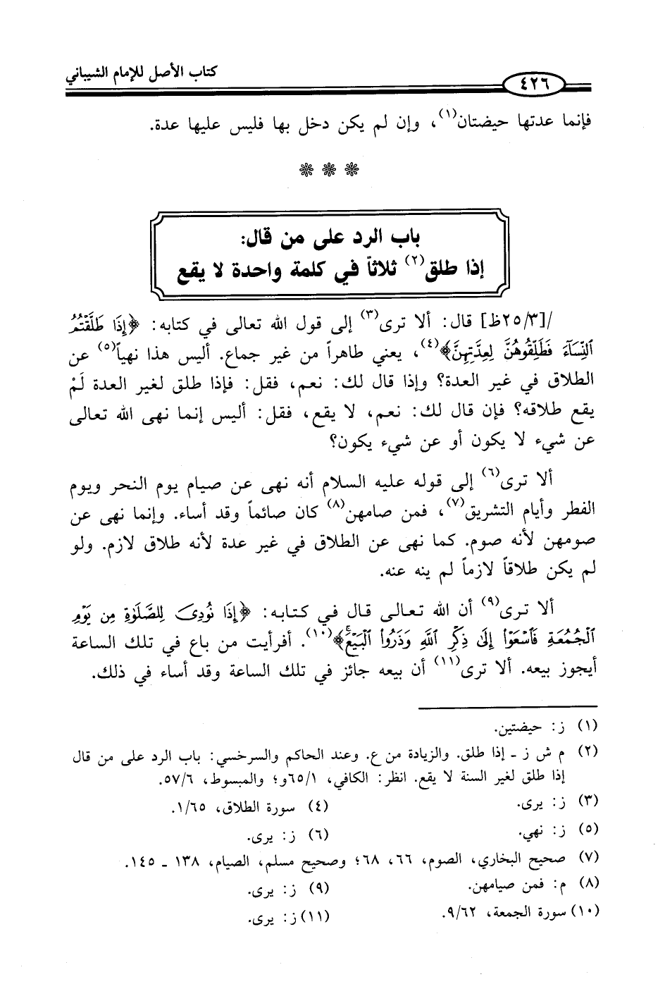 (¬2) م ش ز - إذا طلق. والزيادة من ع. وعند الحاكم والسرخسي: باب الرد على من قال إذا طلق لغير السنة لا يقع. انظر: الكافي، 1/ 65 و؛ والمبسوط، 6/ 57.