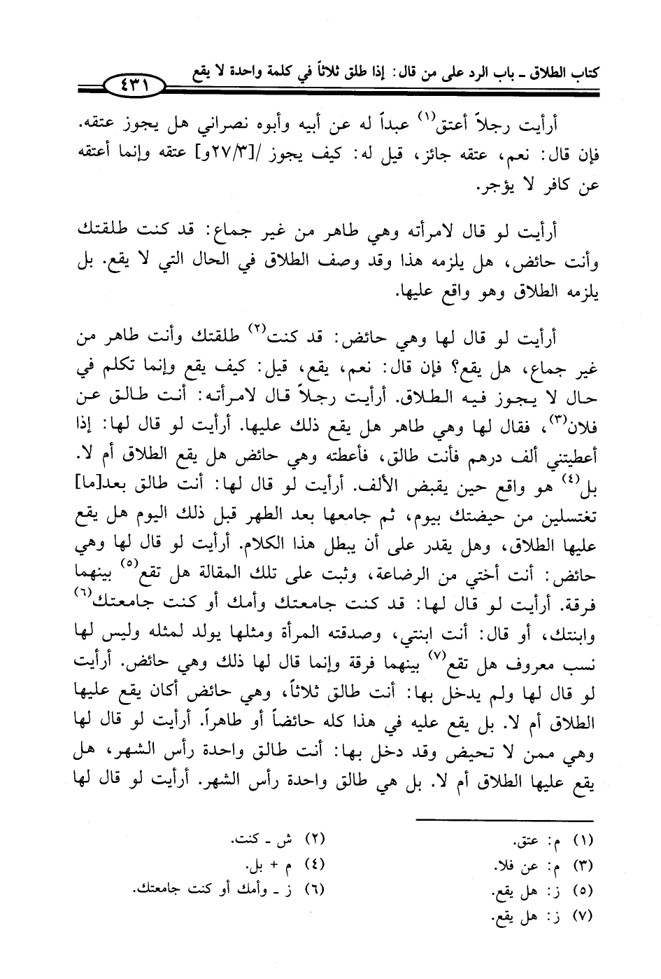 أرأيت لو قال لها وهي حائض: قد كنت (¬2) طلقتك وأنت طاهر من غير جماع، هل يقع؟ فإن قال: نعم، يقع، قيل: كيف يقع وإنما تكلم في حال لا يجوز فيه الطلاق. أرأيت رجلاً قال لامرأته: أنت طالق عن فلان (¬3)، فقال لها وهي طاهر هل يقع ذلك عليها. أرأيت لو قال لها: إذا أعطيتني ألف درهم فأنت طالق، فأعطته وهي حائض هل يقع الطلاق أم لا. بل (¬4) هو واقع حين يقبض الألف. أرأيت لو قال لها: أنت طالق بعد [ما] تغتسلين من حيضتك بيوم، ثم جامعها بعد الطهر قبل ذلك اليوم هل يقع عليها الطلاق، وهل يقدر على أن يبطل هذا الكلام. أرأيت لو قال لها وهي حائض: أنت أختي من الرضاعة، وثبت على تلك المقالة هل تقع (¬5) بينهما فرقة. أرأيت لو قال لها: قد كنت جامعتك وأمك أو كنت جامعتك (¬6) وابنتك، أو قال: أنت ابنتي، وصدقته المرأة ومثلها يولد لمثله وليس لها نسب معروف هل تقع (¬7) بينهما فرقة وإنما قال لها ذلك وهي حائض. أرأيت لو قال لها ولم يدخل بها: أنت طالق ثلاثاً، وهي حائض أكان يقع عليها الطلاق أم لا. بل يقع عليه في هذا كله حائضاً أو طاهراً. أرأيت لو قال لها وهي ممن لا تحيض وقد دخل بها: أنت طالق واحدة رأس الشهر، هل يقع عليها الطلاق أم لا. بل هي طالق واحدة رأس الشهر. أرأيت لو قال لها