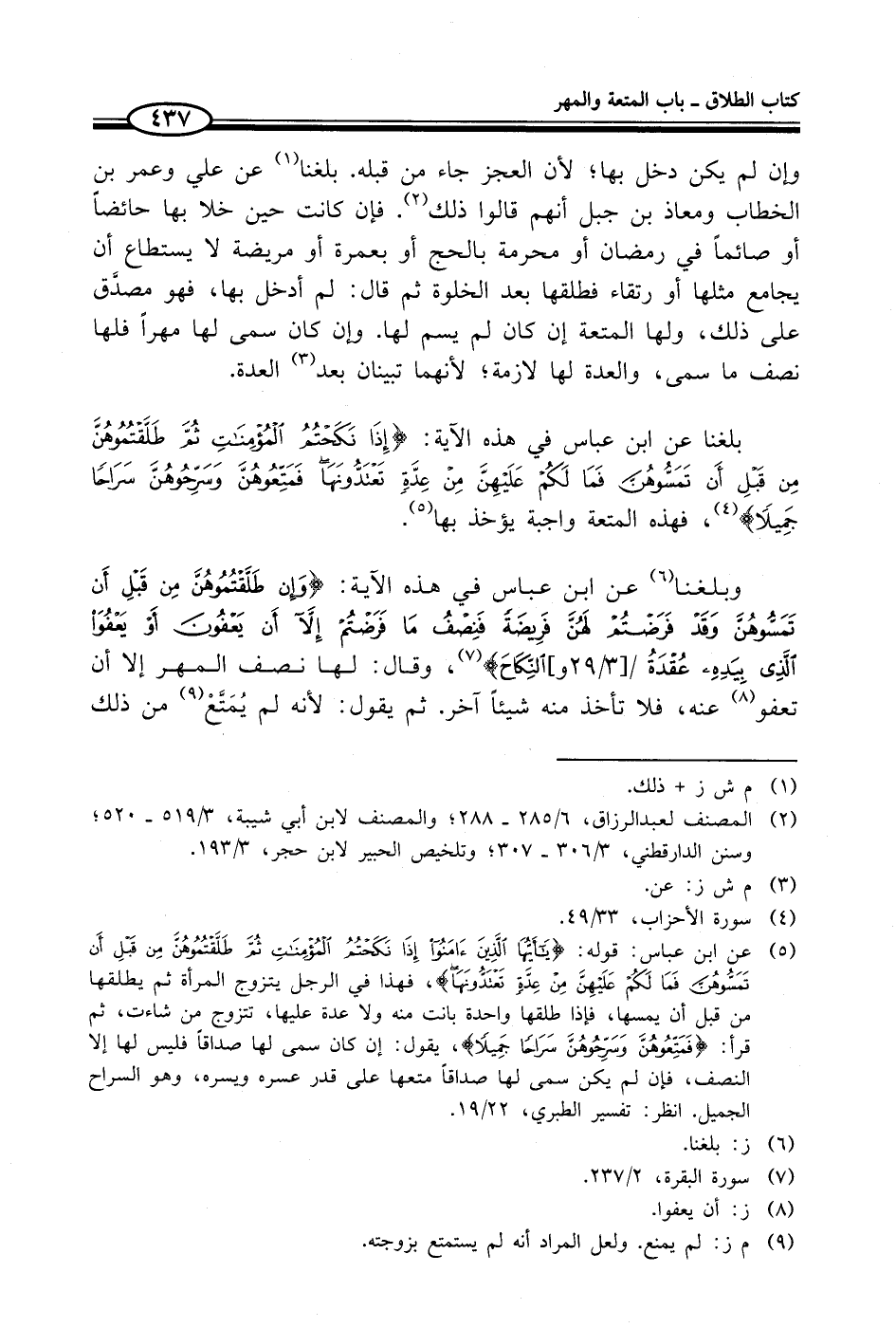 (¬5) عن ابن عباس: قوله: {يَاأَيُّهَا الَّذِينَ آمَنُوا إِذَا نَكَحْتُمُ الْمُؤْمِنَاتِ ثُمَّ طَلَّقْتُمُوهُنَّ مِنْ قَبْلِ أَنْ تَمَسُّوهُنَّ فَمَا لَكُمْ عَلَيْهِنَّ مِنْ عِدَّةٍ تَعْتَدُّونَهَا}، فهذا في الرجل يتزوج المرأة ثم يطلقها من قبل أن يمسها، فإذا طلقها واحدة بانت منه ولا عدة عليها، تتزوج من شاءت، ثم قرأ: {فَمَتِّعُوهُنَّ وَسَرِّحُوهُنَّ سَرَاحًا جَمِيلًا}، يقول: إن كان سمى لها صداقاً فليس لها إلا النصف، فإن لم يكن سمى لها صداقاً متعها على قدر عسره ويسره، وهو السراح الجميل. انظر: تفسير الطبري، 22/ 19.