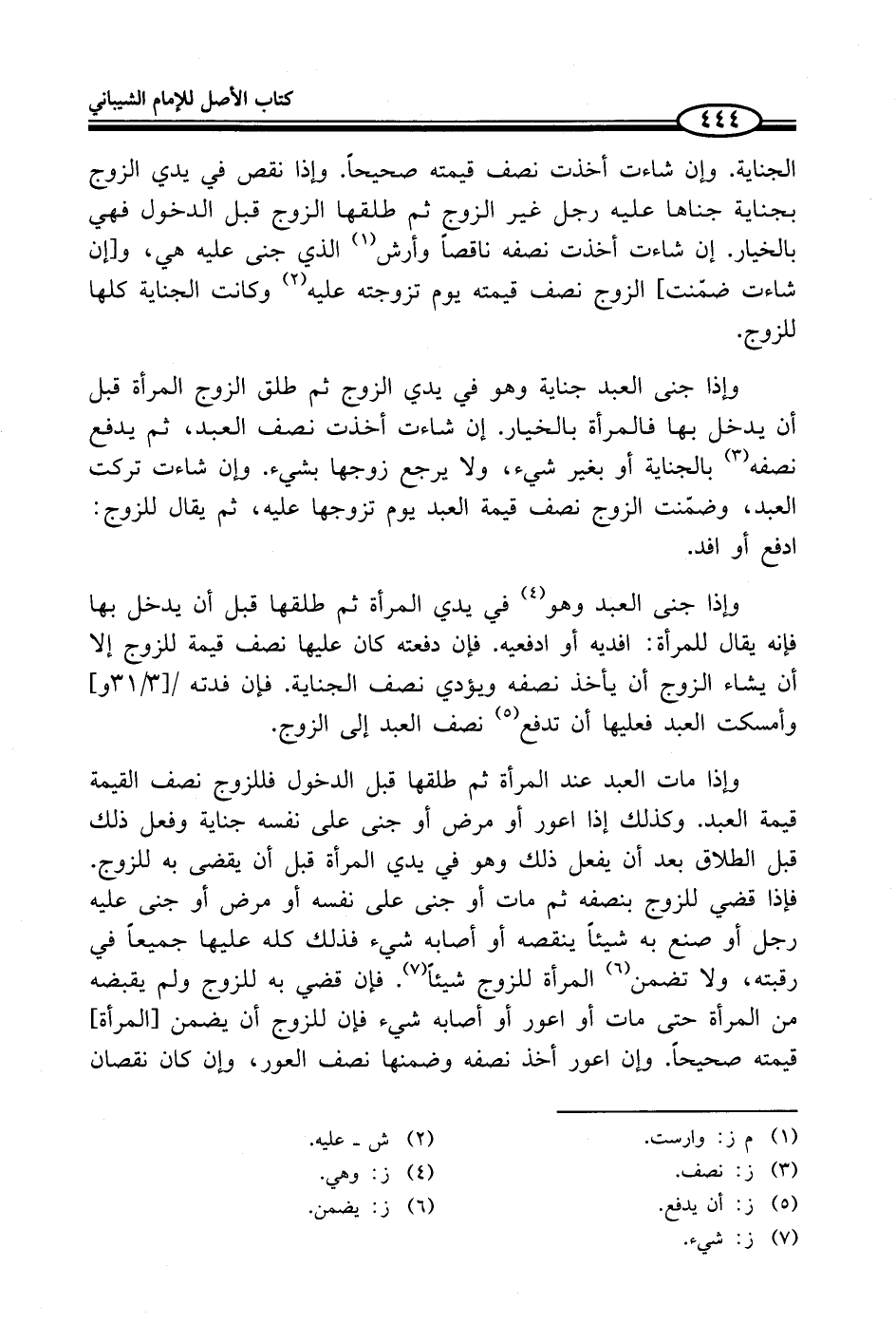 وإذا مات العبد عند المرأة ثم طلقها قبل الدخول فللزوج نصف القيمة قيمة العبد. وكذلك إذا اعور أو مرض أو جنى على نفسه جناية وفعل ذلك قبل الطلاق بعد أن يفعل ذلك وهو في يدي المرأة قبل أن يقضى به للزوج. فإذا قضي للزوج بنصفه ثم مات أو جنى على نفسه أو مرض أو جنى عليه رجل أو صنع به شيئاً ينقصه أو أصابه شيء فذلك كله عليها جميعاً في رقبته، ولا تضمن (¬6) المرأة للزوج شيئاً (¬7). فإن قضي به للزوج ولم يقبضه من المرأة حتى مات أو اعور أو أصابه شيء فإن للزوج أن يضمن [المرأة] قيمته صحيحاً. وإن اعور أخذ نصفه وضمنها نصف العور، وإن كان نقصان