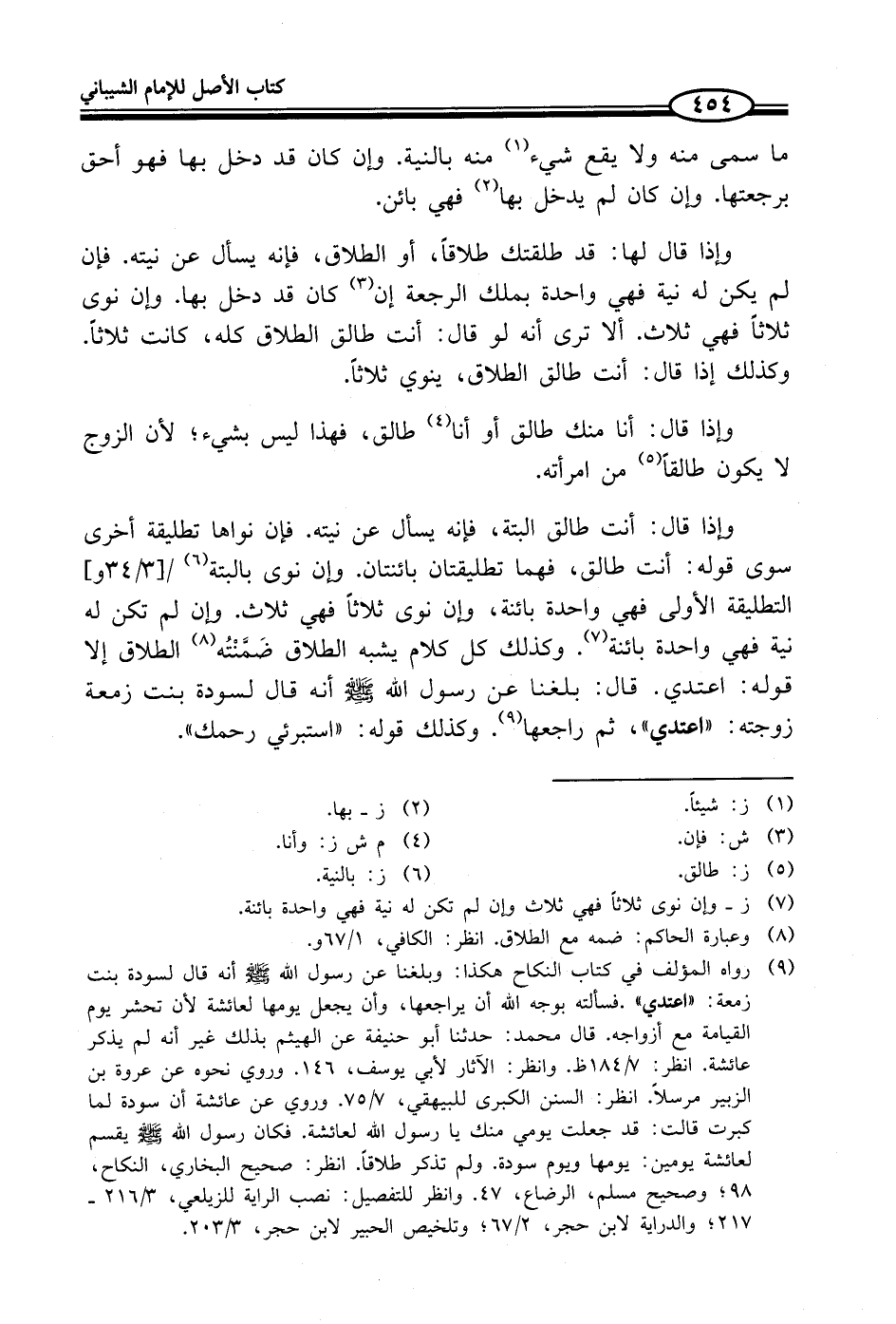 (¬9) رواه المؤلف في كتاب النكاح هكذا: وبلغنا عن رسول الله - صلى الله عليه وسلم - أنه قال لسودة بنت زمعة: "اعتدي". فسألته بوجه الله أن يراجعها، وأن يجعل يومها لعائشة لأن تحشر يوم القيامة مع أزواجه. قال محمد: حدثنا أبو حنيفة عن الهيثم بذلك غير أنه لم يذكر عائشة. انظر: 7/ 184 ظ. وانظر: الآثار لأبي يوسف، 146. وروي نحوه عن عروة بن الزبير مرسلاً. انظر: السنن الكبرى للبيهقي، 7/ 75. وروي عن عائشة أن سودة لما كبرت قالت: قد جعلت يومي منك يا رسول الله لعائشة. فكان رسول - صلى الله عليه وسلم - يقسم لعائشة يومين: يومها ويوم سودة. ولم تذكر طلاقاً. انظر: صحيح البخاري، النكاح، 98؛ وصحيح مسلم، الرضاع، 47. وانظر للتفصيل: نصب الراية للزيلعي، 3/ 216 - 217؛ والدراية لابن حجر، 2/ 67؛ وتلخيص الحبير لابن حجر، 3/ 203.