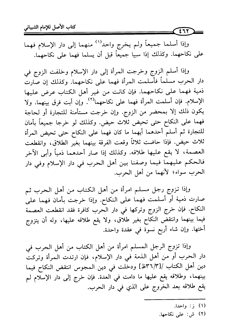 وإذا تزوج رجل مسلم امرأة من أهل الكتاب من أهل الحرب ثم صارت ذمية أو أسلمت فهما على النكاح. وإذا خرجت بأمان فهما على النكاح. فإن خرج الزوج وتركها في دار الحرب كافرة فقد انقطعت العصمة فيما بينهما وانتقض النكاح بغير طلاق، ولا يقع طلاقه عليها، وله أن يتزوج أختها. وإن شاء أربع نسوة في عقدة واحدة.