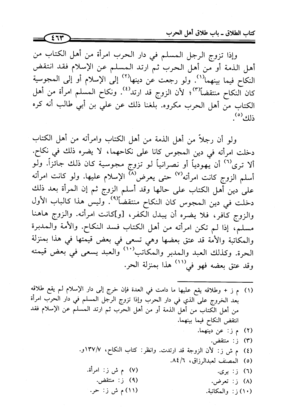 ولو أن رجلاً من أهل الذمة من أهل الكتاب وامرأته من أهل الكتاب دخلت امرأته في دين المجوس كانا على نكاحهما، لا يضره ذلك في نكاح. ألا ترى (¬6) أن يهودياً أو نصرانياً لو تزوج مجوسية كان ذلك جائزاً. ولو أسلم الزوج كانت امرأته (¬7) حتى يعرض (¬8) الإسلام عليها. ولو كانت امرأته على دين أهل الكتاب على حالها وقد أسلم الزوج ثم إن المرأة بعد ذلك دخلت في دين المجوس كان النكاح منتقضًا (¬9). وليس هذا كالباب الأول والزوج كافر، فلا يضره أن يبدل الكفر، [و] كانت امرأته. والزوج ها هنا مسلم، إذا لم تكن امرأته من أهل الكتاب فسد النكاح. والأمة والمدبرة والمكاتبة والأمة قد عتق بعضها وهي تسعى في بعض قيمتها في هذا بمنزلة الحرة. وكذلك العبد والمدبر والمكاتب (¬10) والعبد يسعى في بعض قيمته وقد عتق بعضه فهو في (¬11) هذا بمنزلة الحر.