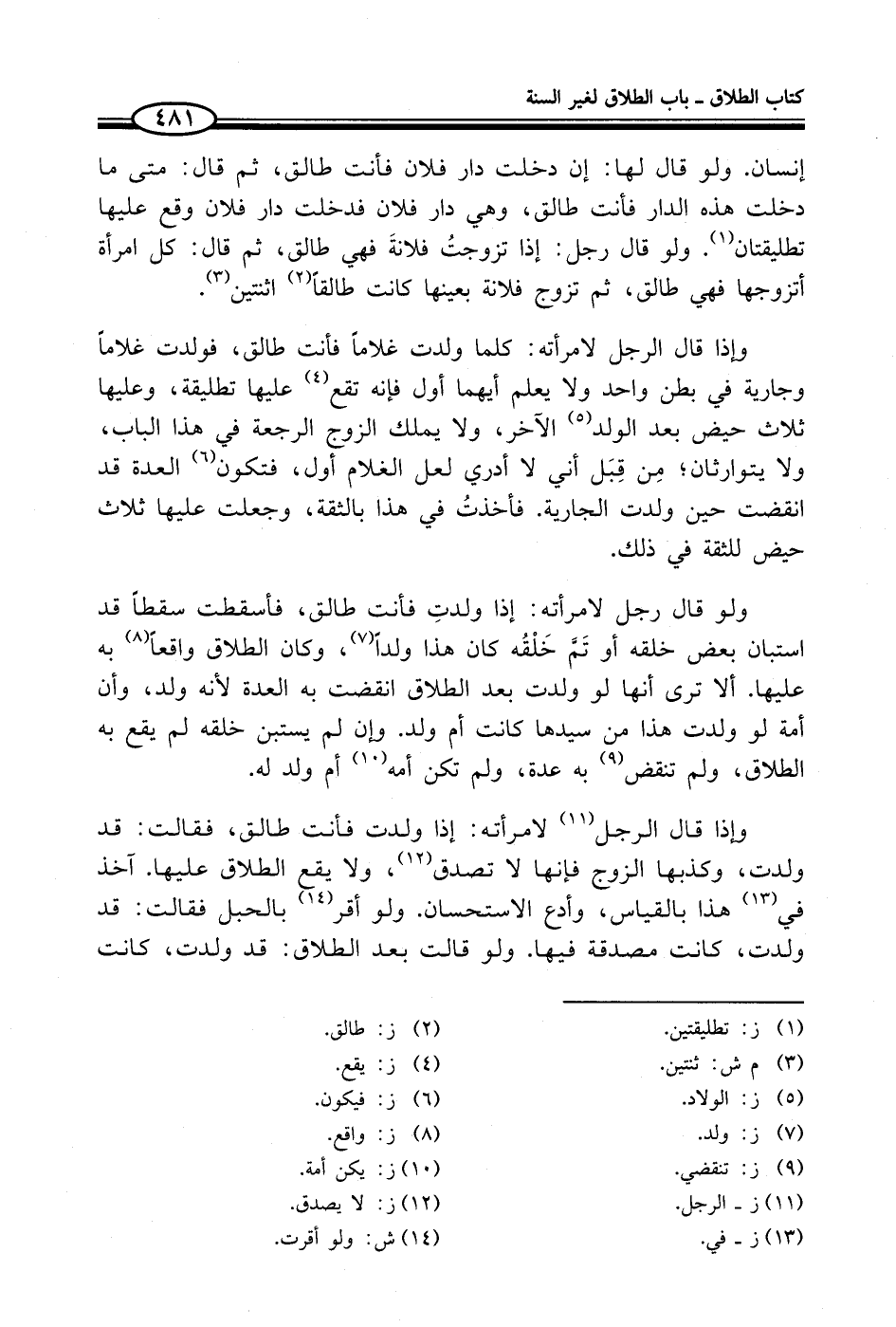 وإذا قال الرجل لامرأته: كلما ولدت غلاماً فأنت طالق، فولدت غلاماً وجارية في بطن واحد ولا يعلم أيهما أول فإنه تقع (¬4) عليها تطليقة، وعليها ثلاث حيض بعد الولد (¬5) الآخر، ولا يملك الزوج الرجعة في هذا الباب، ولا يتوارثان؛ مِن قِبَل أني لا أدري لعل الغلام أول، فتكون (¬6) العدة قد انقضت حين ولدت الجارية. فأخذتُ في هذا بالثقة، وجعلت عليها ثلاث حيض للثقة في ذلك.