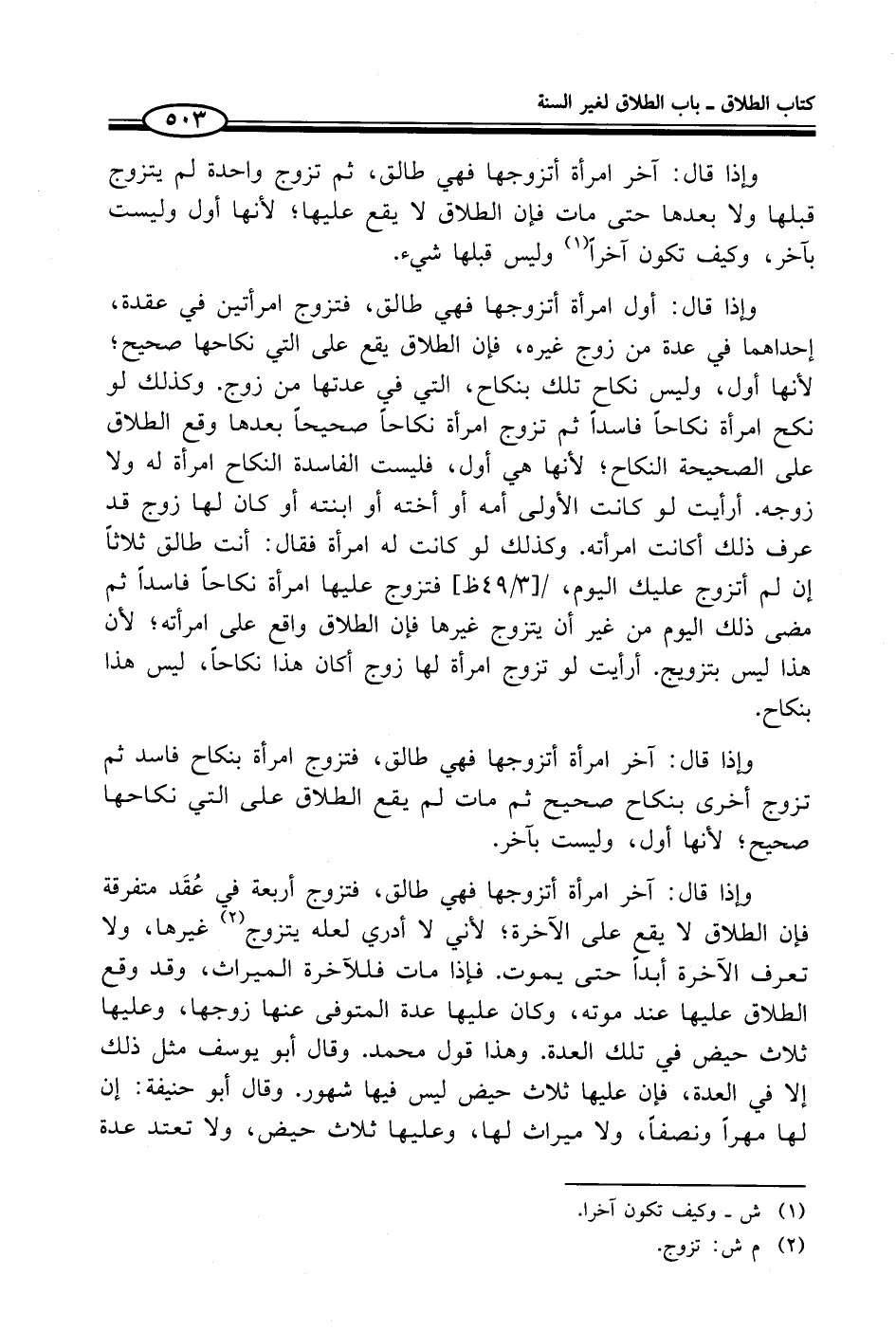 وإذا قال: آخر امرأة أتزوجها فهي طالق، فتزوج أربعة في عُقَد متفرقة فإن الطلاق لا يقع على الآخرة؛ لأني لا أدري لعله يتزوج (¬2) غيرها، ولا تعرف الآخرة أبداً حتى يموت. فإذا مات فللآخرة الميراث، وقد وقع الطلاق عليها عند موته، وكان عليها عدة المتوفى عنها زوجها، وعليها ثلاث حيض في تلك العدة. وهذا قول محمد. وقال أبو يوسف مثل ذلك إلا في العدة، فإن عليها ثلاث حيض ليس فيها شهور. وقال أبو حنيفة: إن لها مهراً ونصفاً، ولا ميراث لها، وعليها ثلاث حيض، ولا تعتد عدة
