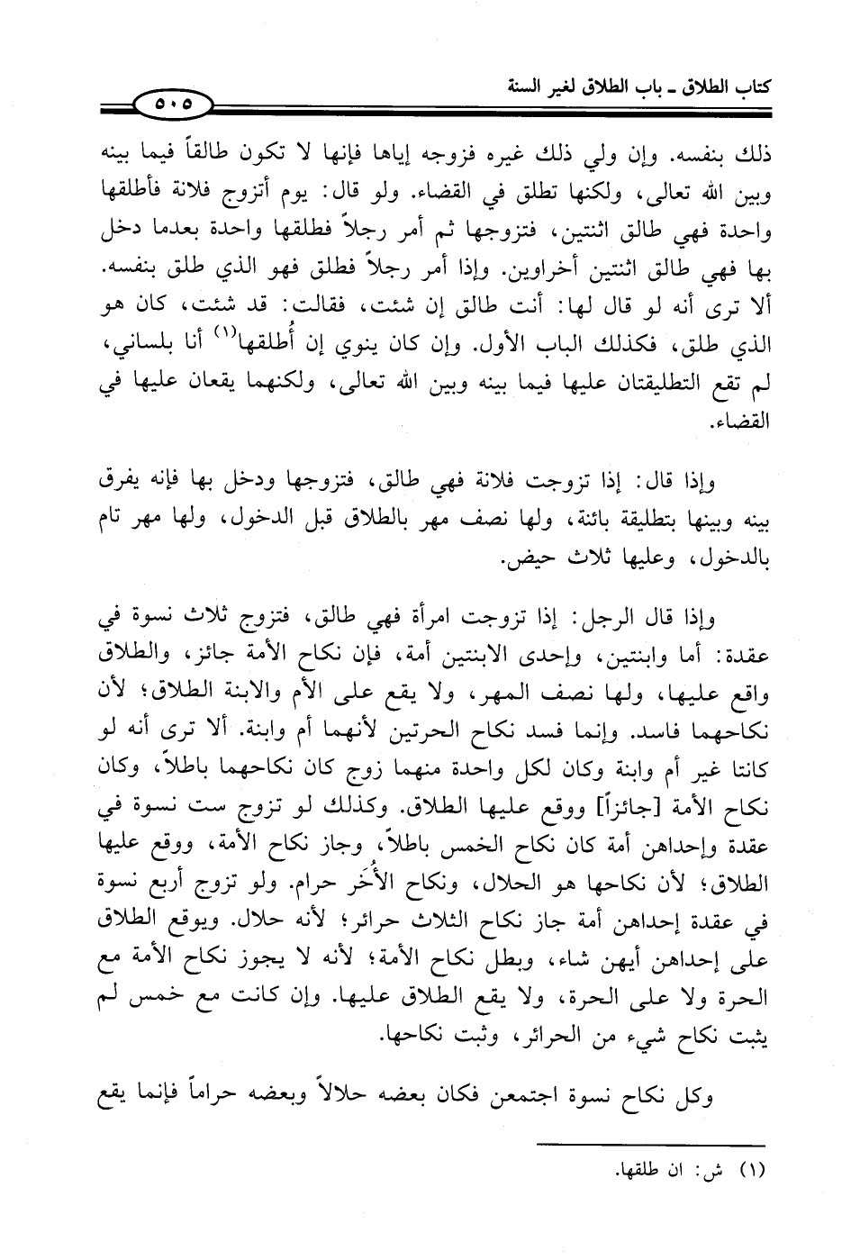 وإذا قال الرجل: إذا تزوجت امرأة فهي طالق، فتزوج ثلاث نسوة في عقدة: أما وابنتين، وإحدى الابنتين أمة، فإن نكاح الأمة جائز، والطلاق واقع عليها، ولها نصف المهر، ولا يقع على الأم والابنة الطلاق؛ لأن نكاحهما فاسد. وإنما فسد نكاح الحرتين لأنهما أم وابنة. ألا ترى أنه لو كانتا غير أم وابنة وكان لكل واحدة منهما زوج كان نكاحهما باطلاً، وكان نكاح الأمة [جائزاً] ووقع عليها الطلاق. وكذلك لو تزوج ست نسوة في عقدة وإحداهن أمة كان نكاح الخمس باطلاً، وجاز نكاح الأمة، ووقع عليها الطلاق؛ لأن نكاحها هو الحلال، ونكاح الأُخَر حرام. ولو تزوج أربع نسوة في عقدة إحداهن أمة جاز نكاح الثلاث حرائر؛ لأنه حلال. ويوقع الطلاق على إحداهن أيهن شاء، وبطل نكاح الأمة؛ لأنه لا يجوز نكاح الأمة مع الحرة ولا على الحرة، ولا يقع الطلاق عليها. وإن كانت مع خمس لم يثبت نكاح شيء من الحرائر، وثبت نكاحها.