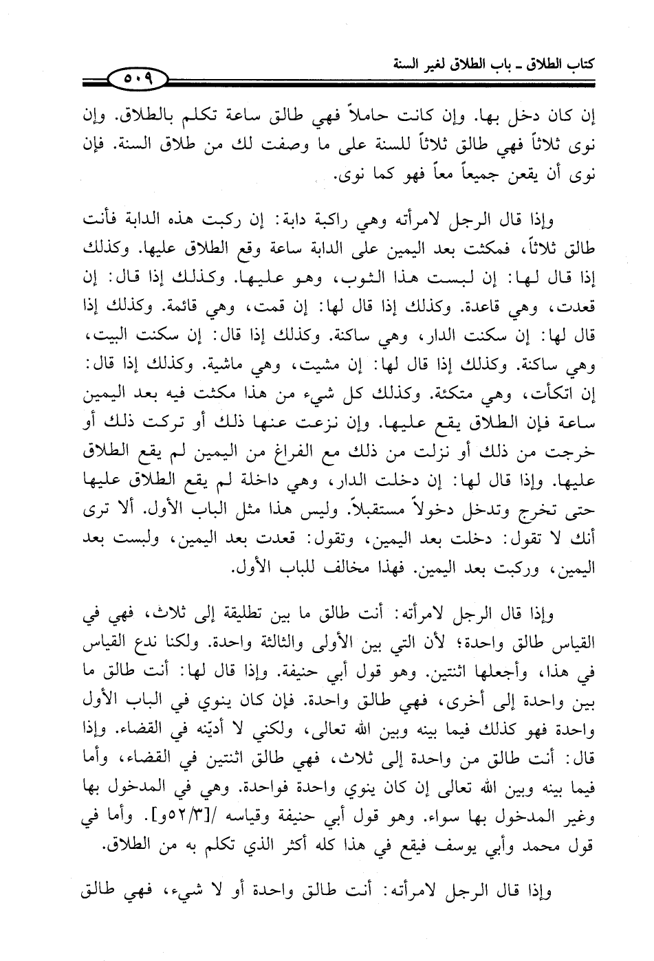 وإذا قال الرجل لامرأته وهي راكبة دابة: إن ركبت هذه الدابة فأنت طالق ثلاثاً، فمكثت بعد اليمين على الدابة ساعة وقع الطلاق عليها. وكذلك إذا قال لها: إن لبست هذا الثوب، وهو عليها. وكذلك إذا قال: إن قعدت، وهي قاعدة. وكذلك إذا قال لها: إن قمت، وهي قائمة. وكذلك إذا قال لها: إن سكنت الدار، وهي ساكنة. وكذلك إذا قال: إن سكنت البيت، وهي ساكنة. وكذلك إذا قال لها: إن مشيت، وهي ماشية. وكذلك إذا قال: إن اتكأت، وهي متكئة. وكذلك كل شيء من هذا مكثت فيه بعد اليمين ساعة فإن الطلاق يقع عليها. وإن نزعت عنها ذلك أو تركت ذلك أو خرجت من ذلك أو نزلت من ذلك مع الفراغ من اليمين لم يقع الطلاق عليها. وإذا قال لها: إن دخلت الدار، وهي داخلة لم يقع الطلاق عليها حتى تخرج وتدخل دخولاً مستقبلاً. وليس هذا مثل الباب الأول. ألا ترى أنك لا تقول: دخلت بعد اليمين، وتقول: قعدت بعد اليمين، ولبست بعد اليمين، وركبت بعد اليمين. فهذا مخالف للباب الأول.