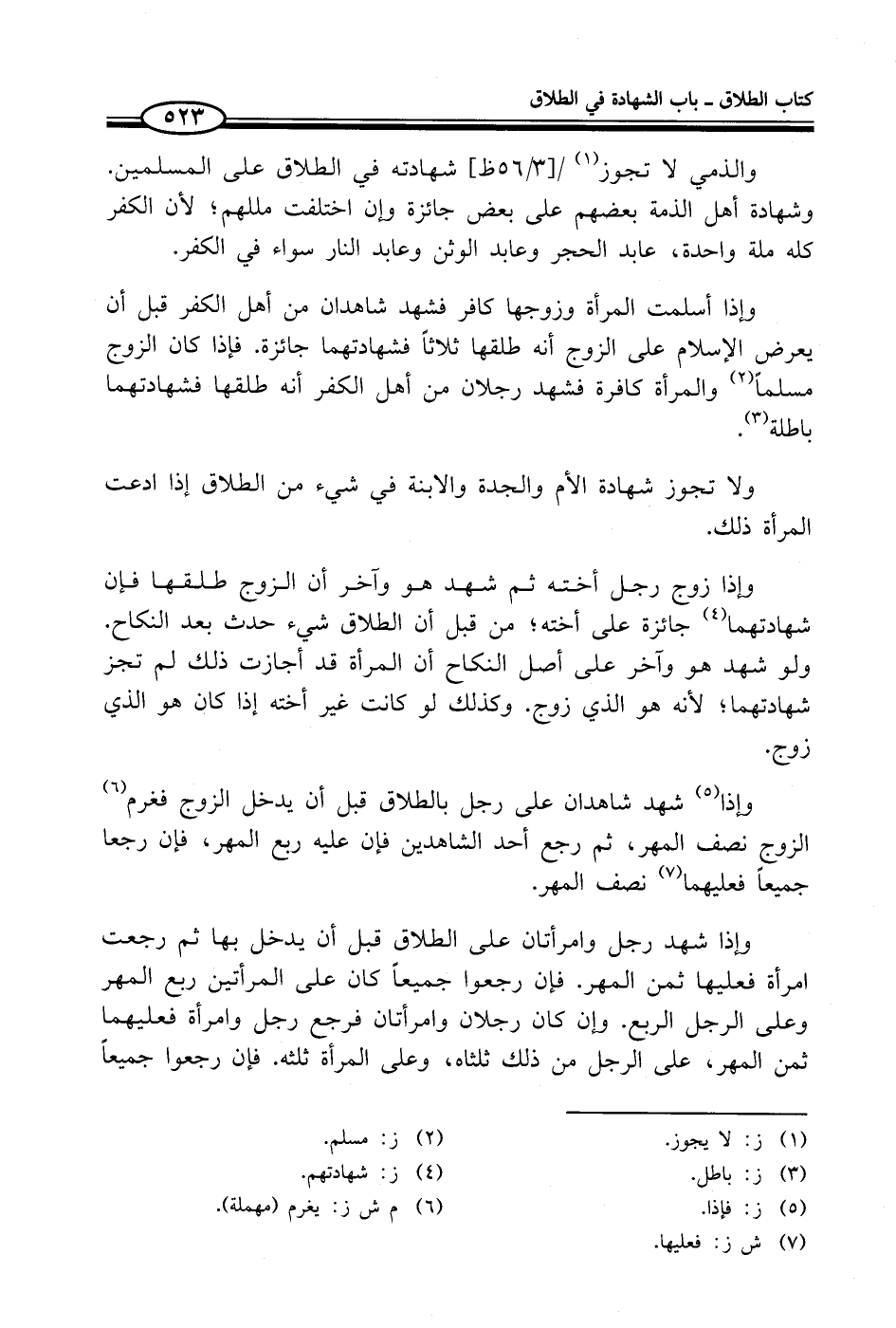 والذمي لا تجوز (¬1) شهادته في الطلاق على المسلمين. وشهادة أهل الذمة بعضهم على بعض جائزة وإن اختلفت مللهم؛ لأن الكفر كله ملة واحدة، عابد الحجر وعابد الوثن وعابد النار سواء في الكفر.
