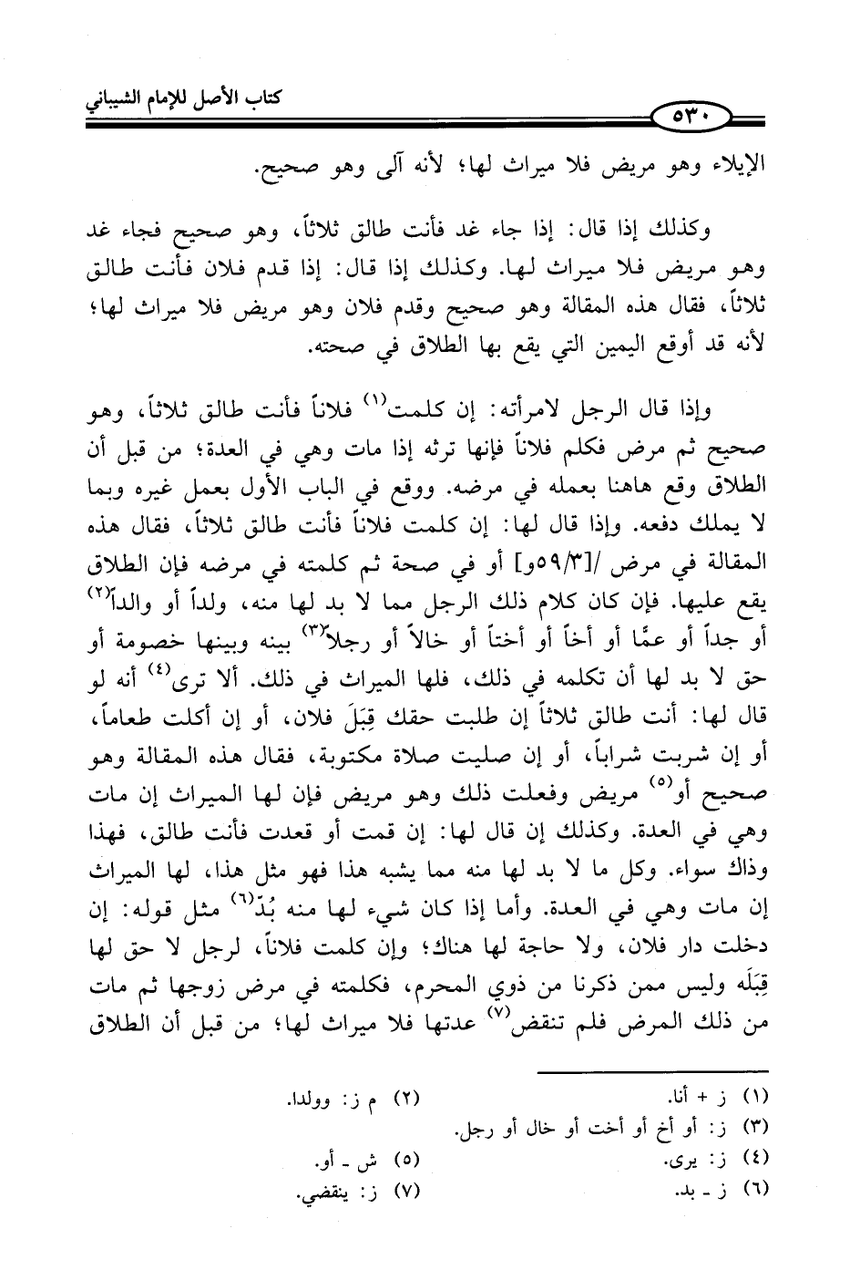 وإذا قال الرجل لامرأته: إن كلمت (¬1) فلاناً فأنت طالق ثلاثاً، وهو صحيح ثم مرض فكلم فلاناً فإنها ترثه إذا مات وهي في العدة؛ من قبل أن الطلاق وقع هاهنا بعمله في مرضه. ووقع في الباب الأول بعمل غيره وبما لا يملك دفعه. وإذا قال لها: إن كلمت فلاناً فأنت طالق ثلاثاً، فقال هذه المقالة في مرض أو في صحة ثم كلمته في مرضه فإن الطلاق يقع عليها. فإن كان كلام ذلك الرجل مما لا بد لها منه، ولداً أو والداً (¬2) أو جداً أو عمًّا أو أخاً أو أختاً أو خالاً أو رجلاً (¬3) بينه وبينها خصومة أو حق لا بد لها أن تكلمه في ذلك، فلها الميراث في ذلك. ألا ترى (¬4) أنه لو قال لها: أنت طالق ثلاثاً إن طلبت حقك قِبَلَ فلان، أو إن أكلت طعاماً، أو إن شربت شراباً، أو إن صليت صلاة مكتوبة، فقال هذه المقالة وهو صحيح أو (¬5) مريض وفعلت ذلك وهو مريض فإن لها الميراث إن مات وهي في العدة. وكذلك إن قال لها: إن قمت أو قعدت فأنت طالق، فهذا وذاك سواء. وكل ما لا بد لها منه مما يشبه هذا فهو مثل هذا، لها الميراث إن مات وهي في العدة. وأما إذا كان شيء لها منه بُدّ (¬6) مثل قوله: إن دخلت دار فلان، ولا حاجة لها هناك؛ وإن كلمت فلاناً، لرجل لا حق لها قِبَلَه وليس ممن ذكرنا من ذوي المحرم، فكلمته في مرض زوجها ثم مات من ذلك المرض فلم تنقض (¬7) عدتها فلا ميراث لها؛ من قبل أن الطلاق