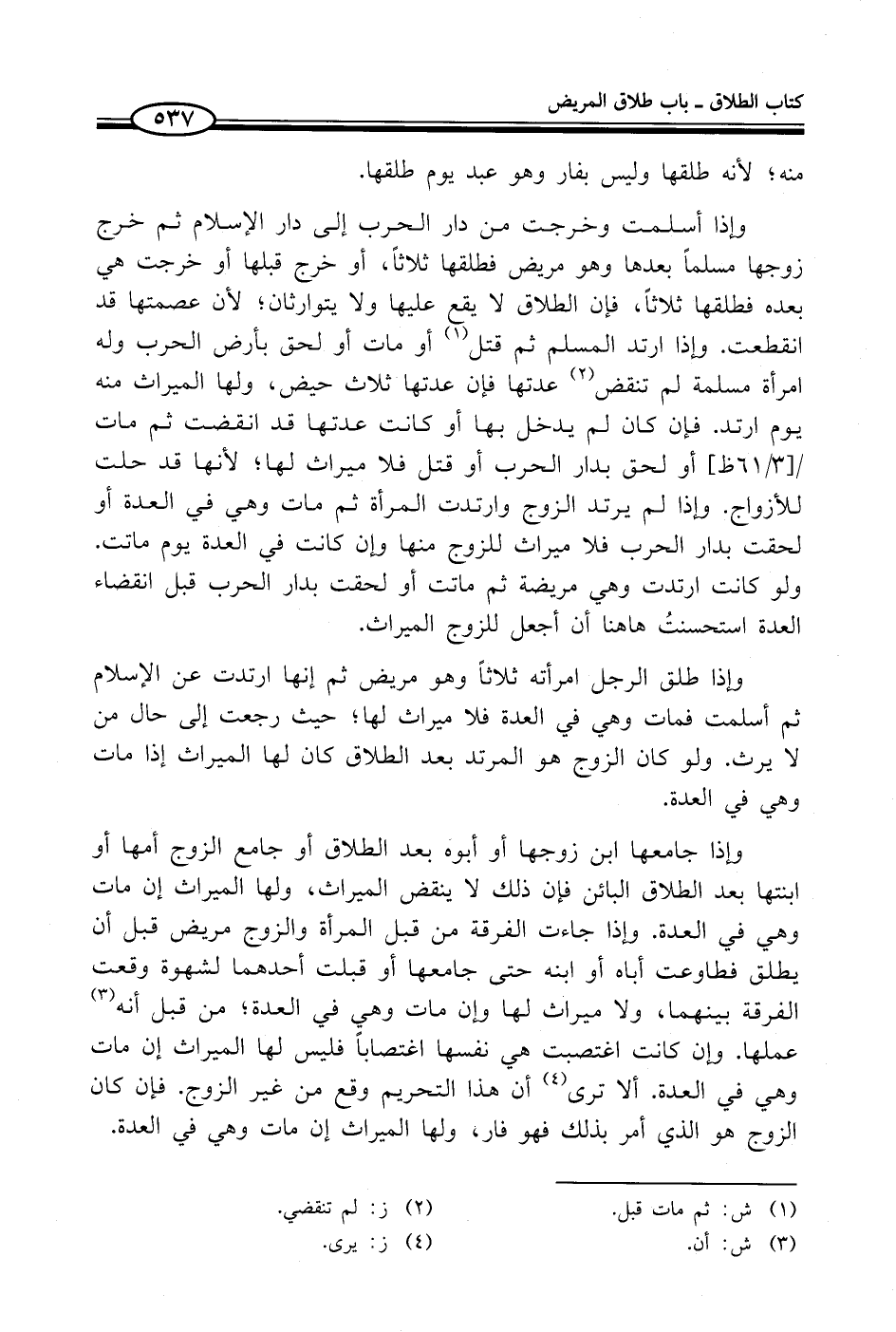وإذا أسلمت وخرجت من دار الحرب إلى دار الإسلام ثم خرج زوجها مسلماً بعدها وهو مريض فطلقها ثلاثاً، أو خرج قبلها أو خرجت هي بعده فطلقها ثلاثاً، فإن الطلاق لا يقع عليها ولا يتوارثان؛ لأن عصمتها قد انقطعت. وإذا ارتد المسلم ثم قتل (¬1) أو مات أو لحق بأرض الحرب وله امرأة مسلمة لم تنقض (¬2) عدتها فإن عدتها ثلاث حيض، ولها الميراث منه يوم ارتد. فإن كان لم يدخل بها أو كانت عدتها قد انقضت ثم مات أو لحق بدار الحرب أو قتل فلا ميراث لها؛ لأنها قد حلت للأزواج. وإذا لم يرتد الزوج وارتدت المرأة ثم مات وهي في العدة أو لحقت بدار الحرب فلا ميراث للزوج منها وإن كانت في العدة يوم ماتت. ولو كانت ارتدت وهي مريضة ثم ماتت أو لحقت بدار الحرب قبل انقضاء العدة استحسنتُ هاهنا أن أجعل للزوج الميراث.