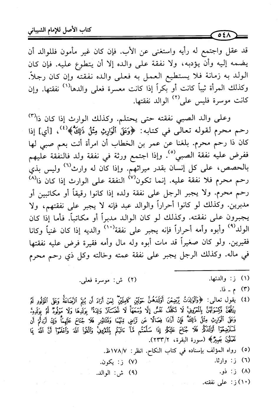وعلى والد الصبي نفقته حتى يحتلم. وكذلك الوارث إذا كان ذا (¬3) رحم محرم لقوله تعالى في كتابه: {وَعَلَى الْوَارِثِ مِثْلُ ذَلِكَ} (¬4)، [أي] إذا كان ذا رحم محرم. بلغنا عن عمر بن الخطاب أن امرأة أتت بعم صبي لها ففرض عليه نفقة الصبي (¬5). وإذا اجتمع ورثة في نفقة ولد فالنفقة عليهم بالحصص، على كل إنسان بقدر ميراثهم. وإذا كان له وارث (¬6) وليس بذي رحم محرم فلا نفقة عليه. إنما تكون (¬7) النفقة على الوارث إذا كان ذا (¬8) رحم محرم. ولا يجبر الرجل على نفقة ولده إذا كانوا رقيقاً أو مكاتبين أو مدبرين. وكذلك لو كانوا أحراراً والوالد عبد فإنه لا يجبر على نفقتهم، ولا يجبرون على نفقته. وكذلك لو كان الوالد مدبراً أو مكاتباً. فأما إذا كان الولد (¬9) وأبوه وأمه أحراراً فإنه يجبر على نفقة (¬10) والديه إذا كان غنياً وكانا فقيرين. ولو كان صغيراً قد مات أبوه وله مال وأمه فقيرة فرض عليه نفقتها في ماله. وكذلك الرجل يجبر على نفقة عمته وخالته وكل ذي رحم محرم