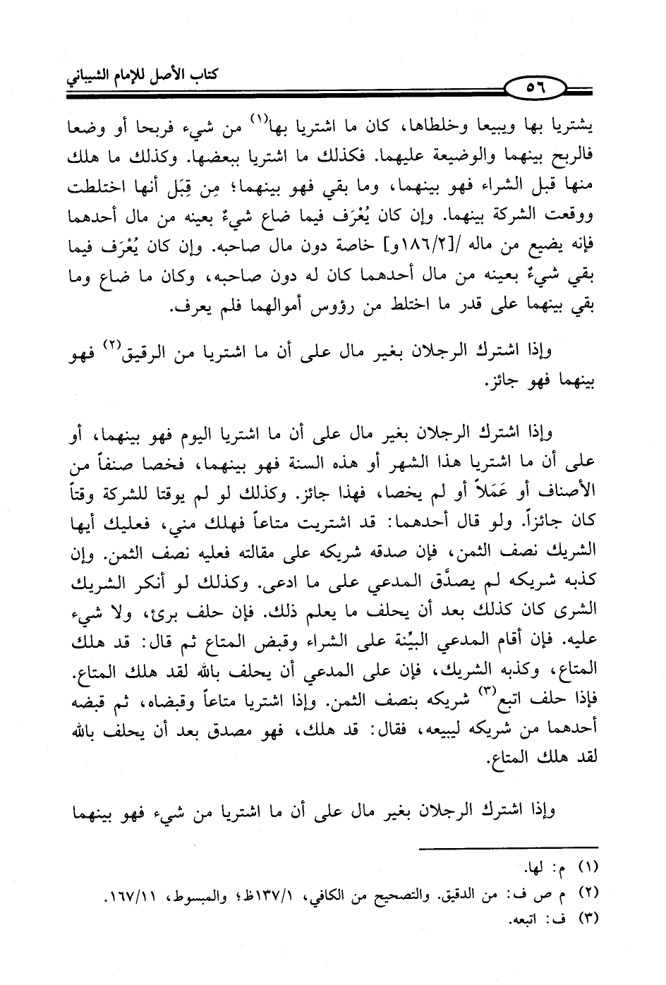 يشتريا ما ويبيعا وخلطاها، كان ما اشتريا ما (¬1) من شيء فربحا أو وضعا فالربح بينهما والوضيعة عليهما. فكذلك ما اشتريا ببعضها. وكذلك ما هلك منها قبل الشراء فهو بينهما، وما بقي فهو بينهما؛ مِن قِبَل أنها اختلطت ووقعت الشركة بينهما. وإن كان يُعْرَف فيما ضاع شيءٌ بعينه من مال أحدهما فإنه يضيع من ماله خاصة دون مال صاحبه. وإن كان يُعْرَف فيما بقي شيءٌ بعينه من مال أحدهما كان له دون صاحبه، وكان ما ضاع وما بقي بينهما على قدر ما اختلط من رؤوس أموالهما فلم يعرف.