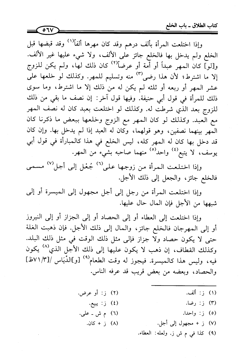 وإذا اختلعت إلى العطاء أو إلى الحصاد أو إلى الجزاز أو إلى النيروز أو إلى المهرجان فالخلع جائز، والمال إلى ذلك الأجل. فإن ذهبت الغلة حتى لا يكون حصاد ولا جزاز فإلى مثل ذلك الوقت في مثل ذلك البلد. وكذلك القطاف، إن ذهب لا يكون عليها إلى ذلك الأجل الذي (¬8) يكون فيه، وليس هذا كالميسرة. فيجوز له وقت الطعام (¬9) [و] الدِّيَاس والحصاد، وبعضه من بعض قريب قد عرفه الناس.