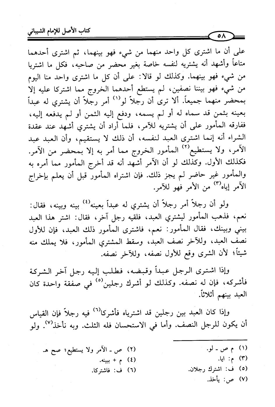 على أن ما اشترى كل واحد منهما من شيء فهو بينهما، ثم اشترى أحدهما متاعاً وأشهد أنه يشتريه لنفسه خاصة بغير محضر من صاحبه، فكل ما اشتريا من شيء فهو بينهما. وكذلك لو قالا: على أن كل ما اشترى واحد منا اليوم من شيء فهو بيننا نصفين، لم يستطع أحدهما الخروج مما اشتركا عليه إلا بمحضر منهما جميعاً. ألا ترى أن رجلاً لو (¬1) أمر رجلاً أن يشتري له عبداً بعينه بثمن قد سماه له أو لم يسمه، ودفع إليه الثمن أو لم يدفعه إليه، ففارقه المأمور على أن يشتريه للآمر؛ فلما أراد أن يشتري أشهد عند عقدة الشراء أنه إنما اشترى العبد لنفسه، أن ذلك لا يستقيم، وأن العبد عبد الآمر؛ ولا يستطيع (¬2) المأمور الخروج مما أمر به إلا بمحضر من الآمر. فكذلك الأول. وكذلك لو أن الآمر أشهد أنه قد أخرج المأمور مما أمره به والمأمور غير حاضر لم يجز ذلك. فإن اشتراه المأمور قبل أن يعلم بإخراج الآمر إياه (¬3) من الأمر فهو للآمر.