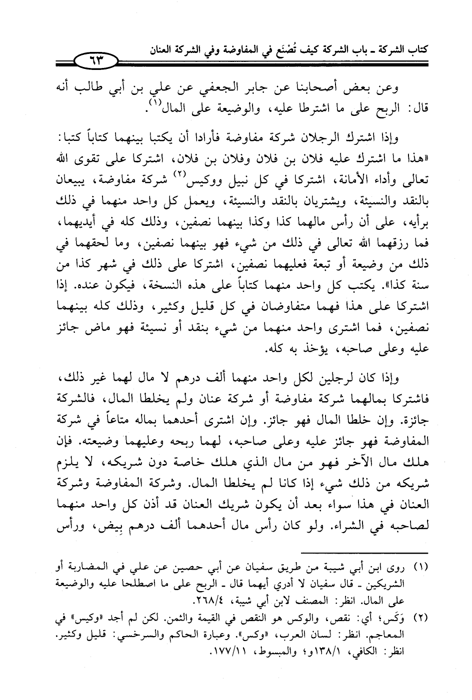 وإذا اشترك الرجلان شركة مفاوضة فأرادا أن يكتبا بينهما كتاباً كتبا: "هذا ما اشترك عليه فلان بن فلان وفلان بن فلان، اشتركا على تقوى الله تعالى وأداء الأمانة، اشتركا في كل نبيل ووكيس (¬2) شركة مفاوضة، يبيعان بالنقد والنسيئة، ويشتريان بالنقد والنسيئة، ويعمل كل واحد منهما في ذلك برأيه، على أن رأس مالهما كذا وكذا بينهما نصفين، وذلك كله في أيديهما، فما رزقهما الله تعالى في ذلك من شيء فهو بينهما نصفين، وما لحقهما في ذلك من وضيعة أو تبعة فعليهما نصفين، اشتركا على ذلك في شهر كذا من سنة كذا". يكتب كل واحد منهما كتاباً على هذه النسخة، فيكون عنده. إذا اشتركا على هذا فهما متفاوضان في كل قليل وكثير، وذلك كله بينهما نصفين، فما اشترى واحد منهما من شيء بنقد أو نسيئة فهو ماض جائز عليه وعلى صاحبه، يؤخذ به كله.