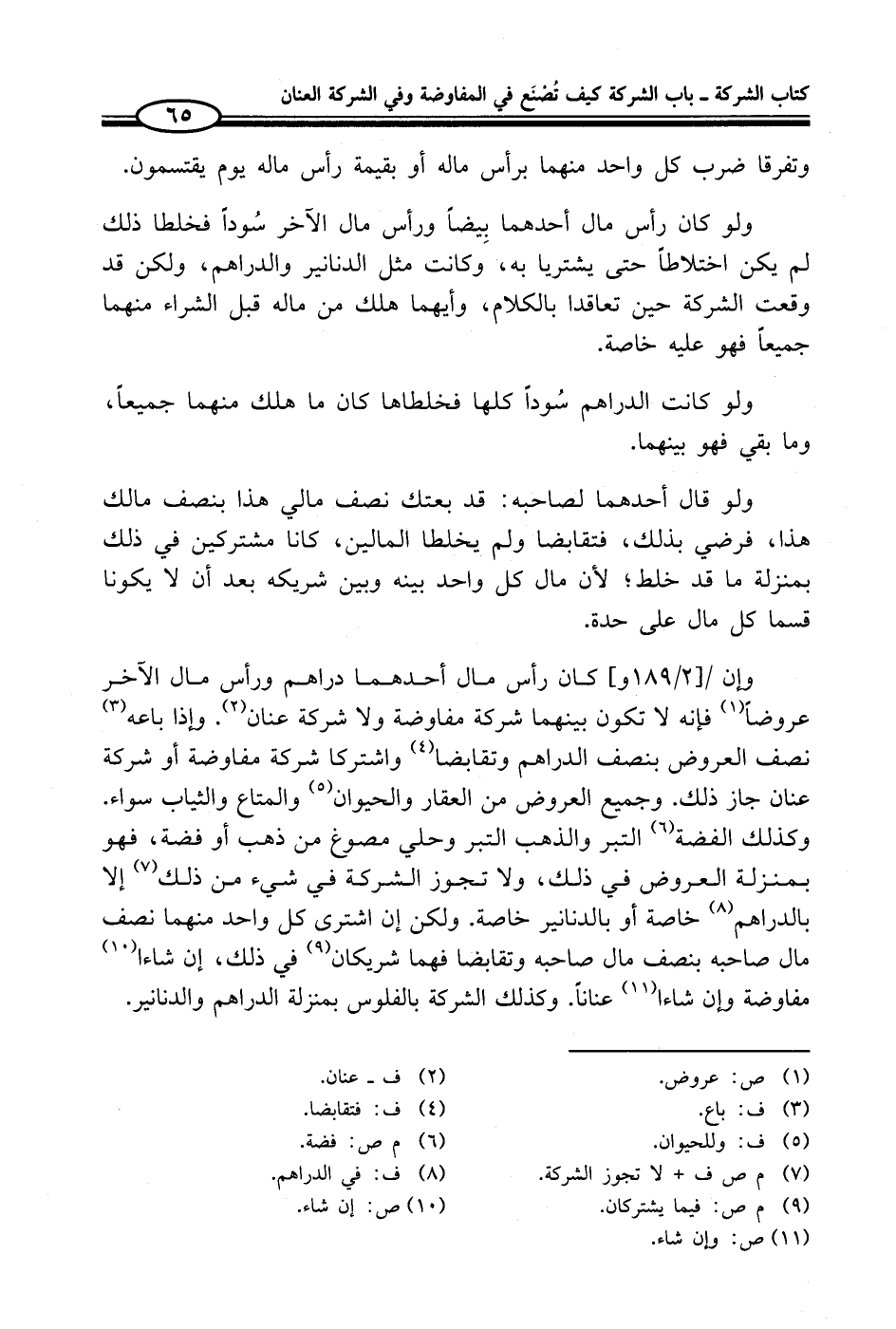 وإن كان رأس مال أحدهما دراهم ورأس مال الآخر عروضاً (¬1) فإنه لا تكون بينهما شركة مفاوضة ولا شركة عنان (¬2). وإذا باعه (¬3) نصف العروض بنصف الدراهم وتقابضا (¬4) واشتركا شركة مفاوضة أو شركة عنان جاز ذلك. وجميع العروض من العقار والحيوان (¬5) والمتاع والثياب سواء. وكذلك الفضة (¬6) التبر والذهب التبر وحلي مصوغ من ذهب أو فضة، فهو بمنزلة العروض في ذلك، ولا تجوز الشركة في شيء من ذلك (¬7) إلا بالدراهم (¬8) خاصة أو بالدنانير خاصة. ولكن إن اشترى كل واحد منهما نصف مال صاحبه بنصف مال صاحبه وتقابضا فهما شريكان (¬9) في ذلك، إن شاءا (¬10) مفاوضة وإن شاءا (¬11) عناناً. وكذلك الشركة بالفلوس بمنزلة الدراهم والدنانير.