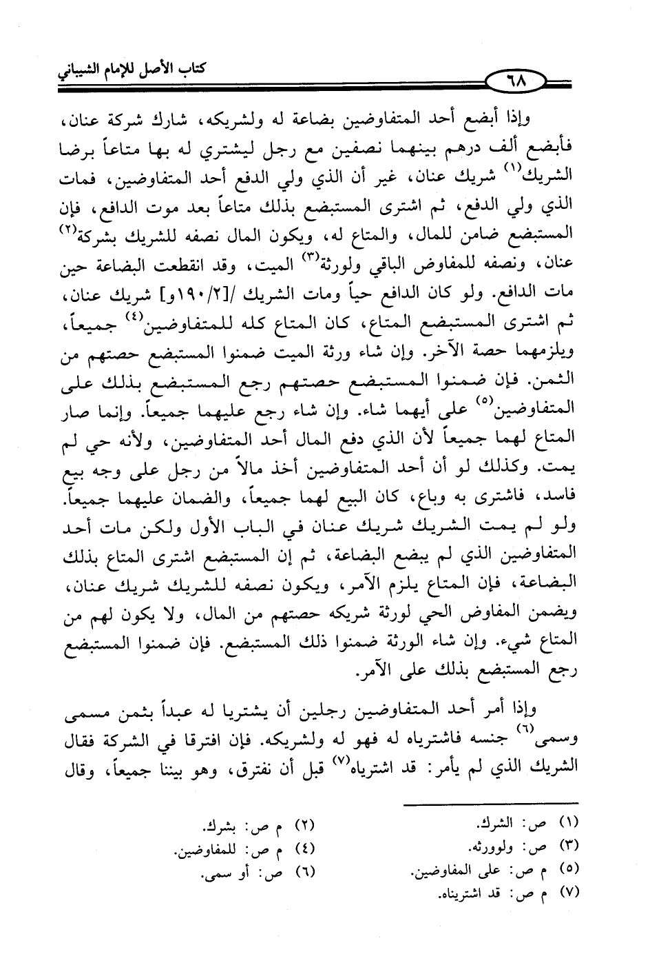 وإذا أبضع أحد المتفاوضين بضاعة له ولشريكه، شارك شركة عنان، فأبضع ألف درهم بينهما نصفين مع رجل ليشتري له ما متاعاً برضا الشريك (¬1) شريك عنان، غير أن الذي ولي الدفع أحد المتفاوضين، فمات الذي ولي الدفع، ثم اشترى المستبضع بذلك متاعاً بعد موت الدافع، فإن المستبضع ضامن للمال، والمتاع له، ويكون المال نصفه للشريك بشركة (¬2) عنان، ونصفه للمفاوض الباقي ولورثة (¬3) الميت، وقد انقطعت البضاعة حين مات الدافع. ولو كان الدافع حياً ومات الشريك شريك عنان، ثم اشترى المستبضع المتاع، كان المتاع كله للمتفاوضين (¬4) جميعاً، ويلزمهما حصة الآخر. وإن شاء ورثة الميت ضمنوا المستبضع حصتهم من الثمن. فإن ضمنوا المستبضع حصتهم رجع المستبضع بذلك على المتفاوضين (¬5) على أيهما شاء. وإن شاء رجع عليهما جميعاً. وإنما صار المتاع لهما جميعاً لأن الذي دفع المال أحد المتفاوضين، ولأنه حي لم يمت. وكذلك لو أن أحد المتفاوضين أخذ مالاً من رجل على وجه بيع فاسد، فاشترى به وباع، كان البيع لهما جميعاً، والضمان عليهما جميعاً. ولو لم يمت الشريك شريك عنان في الباب الأول ولكن مات أحد المتفاوضين الذي لم يبضع البضاعة، ثم إن المستبضع اشترى المتاع بذلك البضاعة، فإن المتاع يلزم الآمر، ويكون نصفه للشريك شريك عنان، ويضمن المفاوض الحي لورثة شريكه حصتهم من المال، ولا يكون لهم من المتاع شيء. فإن شاء الورثة ضمنوا ذلك المستبضع. فإن ضمنوا المستبضع رجع المستبضع بذلك على الآمر.