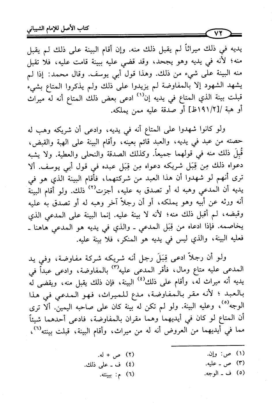 ولو أن رجلاً ادعى قِبَلَ رجل أنه شريكه شركة مفاوضة، وفي يد المدعى عليه متاع ومال، فأقر المدعى عليه (¬3) بالمفاوضة، وادعى عبداً في يديه أنه ميراث له، وأقام على ذلك (¬4) البينة، فإن ذلك يقبل منه، ويقضى له بالعبد؛ لأنه مقر بالمفاوضة، مدع للميراث، فهو المدعي في هذا الوجه (¬5)، وعليه البينة. ولو لم تكن له بينة كان على صاحبه اليمين. ألا ترى أن المتاع لو كان في أيديهما وهما مقران بالمفاوضة، فادعى أحدهما شيئاً مما في أيديهما من العروض أنه له من ميراث، وأقام البينة، قبلت بينته (¬6)،