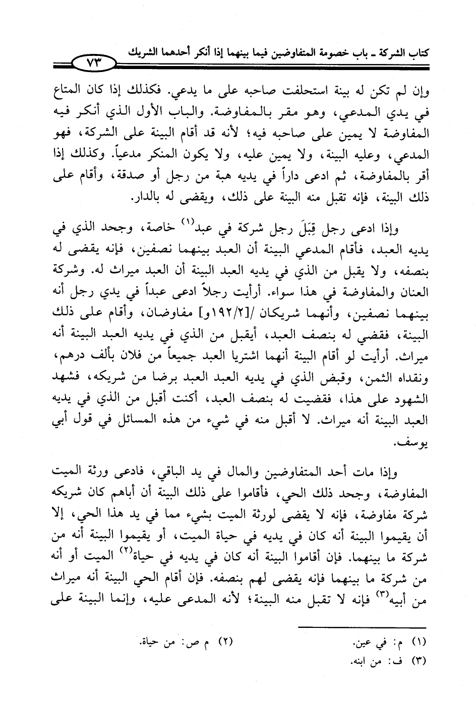 وإذا مات أحد المتفاوضين والمال في يد الباقي، فادعى ورثة الميت المفاوضة، وجحد ذلك الحي، فأقاموا على ذلك البينة أن أباهم كان شريكه شركة مفاوضة، فإنه لا يقضى لورثة الميت بشيء مما في يد هذا الحي، إلا أن يقيموا البينة أنه كان في يديه في حياة الميت، أو يقيموا البينة أنه من شركة ما بينهما. فإن أقاموا البينة أنه كان في يديه في حياة (¬2) الميت أو أنه من شركة ما بينهما فإنه يقضى لهم بنصفه. فإن أقام الحي البينة أنه ميراث من أبيه (¬3) فإنه لا تقبل منه البينة؛ لأنه المدعى عليه، وإنما البينة على