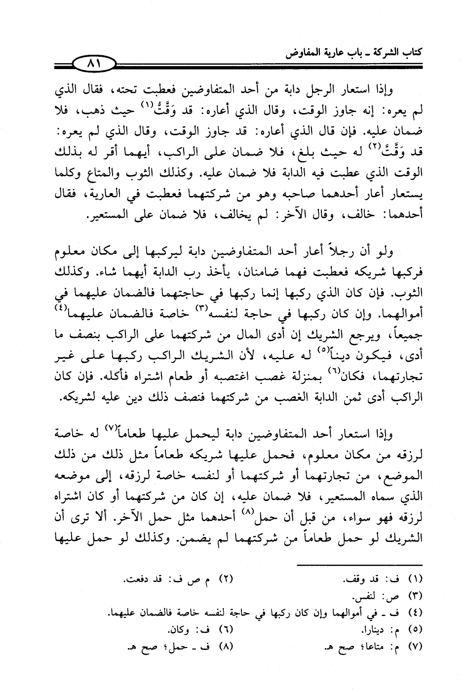 ولو أن رجلاً أعار أحد المتفاوضين دابة ليركبها إلى مكان معلوم فركبها شريكه فعطبت فهما ضامنان، يأخذ رب الدابة أيهما شاء. وكذلك الثوب. فإن كان الذي ركبها إنما ركبها في حاجتهما فالضمان عليهما في أموالهما. وإن كان ركبها في حاجة لنفسه (¬3) خاصة فالضمان عليهما (¬4) جميعاً، ويرجع الشريك إن أدى المال من شركتهما على الراكب بنصف ما أدى، فيكون ديناً (¬5) له عليه، لأن الشريك الراكب ركبها على غير تجارتهما، فكان (¬6) بمنزلة غصب اغتصبه أوطعام اشتراه فأكله. فإن كان الراكب أدى ثمن الدابة الغصب من شركتهما فنصف ذلك دين عليه لشريكه.