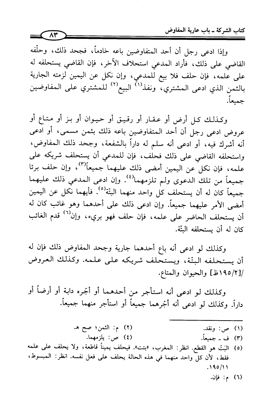 وكذلك كل أرض أو عقار أو رقيق أو حيوان أو بز أو متاع أو عروض ادعى رجل أن أحد المتفاوضين باعه ذلك بثمن مسمى، أو ادعى أنه أشرك فيه، أو ادعى أنه سلم له داراً بالشفعة، وجحد ذلك المفاوض، واستحلفه القاضي على ذلك فحلف، فإن للمدعي أن يستحلف شريكه على علمه، فإن نكل عن اليمين أمضى ذلك عليهما جميعاً (¬3)، وإن حلف برئا جميعاً من تلك الدعوى ولم تلزمهما (¬4). وإن ادعى المدعي ذلك عليهما جميعاً كان له أن يستحلف كل واحد منهما البتّة (¬5). فأيهما نكل عن اليمين أمضى الأمر عليهما جميعاً. وإن ادعى ذلك على أحدهما وهو غائب كان له أن يستحلف الحاضر على علمه، فإن حلف فهو بريء، وإن (¬6) قدم الغائب كان له أن يستحلفه البتّة.