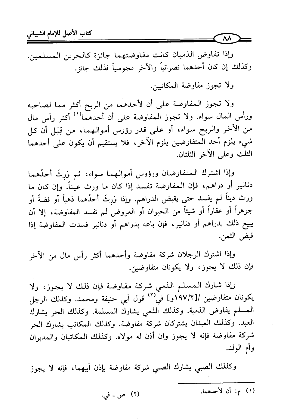 وإذا شارك المسلم الذمي شركة مفاوضة فإن ذلك لا يجوز، ولا يكونان متفاوضين في (¬2) قول أبي حنيفة ومحمد. وكذلك الرجل المسلم يفاوض الذمية. وكذلك الذمي يشارك المسلمة. وكذلك الحر يشارك العبد. وكذلك العبدان يشتركان شركة مفاوضة. وكذلك المكاتب يشارك الحر شركة مفاوضة فمانه لا يجوز وإن أذن له مولاه. وكذلك المكاتبان والمدبران وأم الولد.