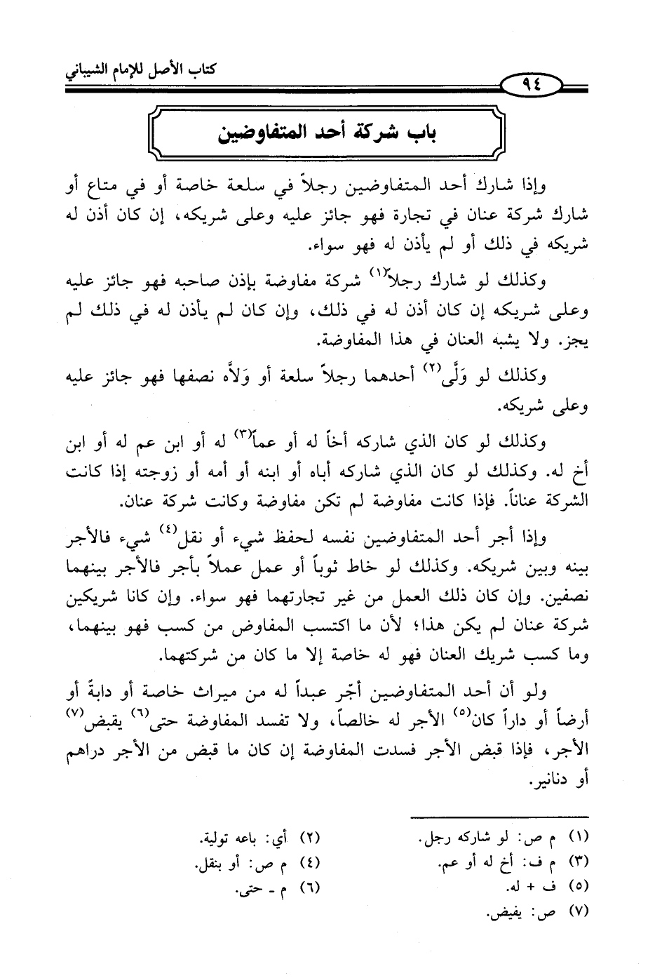 وإذا شارك أحد المتفاوضين رجلاً في سلعة خاصة أو في متاع أو شارك شركة عنان في تجارة فهو جائز عليه وعلى شريكه، إن كان أذن له شريكه في ذلك أو لم يأذن له فهو سواء.
