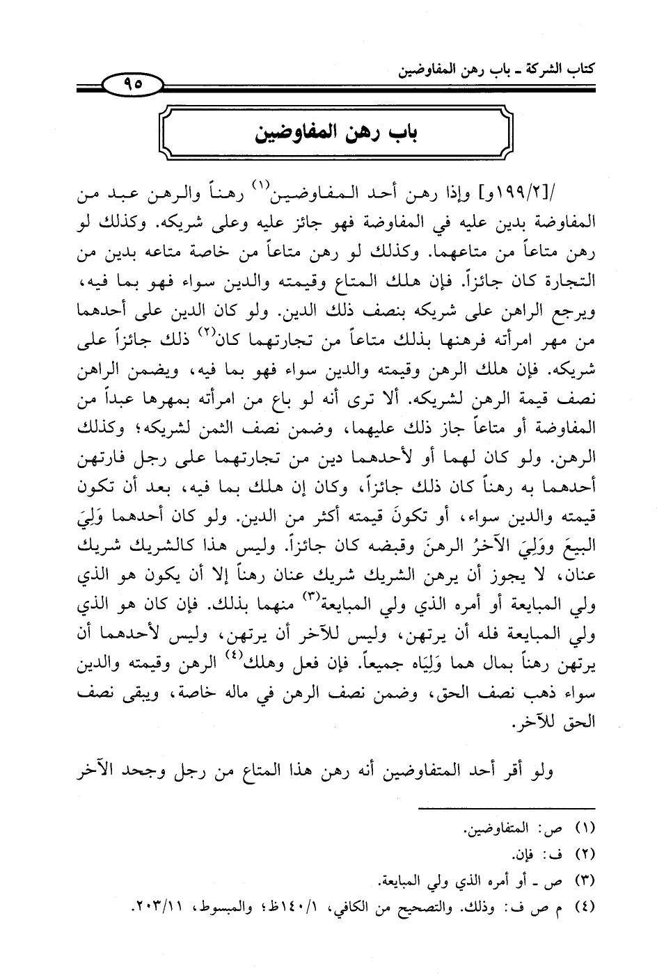 وإذا رهن أحد المفاوضين (¬1) رهناً والرهن عبد من المفاوضة بدين عليه في المفاوضة فهو جائز عليه وعلى شريكه. وكذلك لو رهن متاعاً من متاعهما. وكذلك لو رهن متاعاً من خاصة متاعه بدين من التجارة كان جائزاً. فإن هلك المتاع وقيمته والدين سواء فهو بما فيه، ويرجع الراهن على شريكه بنصف ذلك الدين. ولو كان الدين على أحدهما من مهر امرأته فرهنها بذلك متاعاً من تجارتهما كان (¬2) ذلك جائزاً على شريكه. فإن هلك الرهن وقيمته والدين سواء فهو بما فيه، ويضمن الراهن نصف قيمة الرهن لشريكه. ألا ترى أنه لو باع من امرأته بمهرها عبداً من المفاوضة أو متاعاً جاز ذلك عليهما، وضمن نصف الثمن لشريكه؛ وكذلك الرهن. ولو كان لهما أو لأحدهما دين من تجارتهما على رجل فارتهن أحدهما به رهناً كان ذلك جائزاً، وكان إن هلك بما فيه، بعد أن تكون قيمته والدين سواء، أو تكونَ قيمته أكثر من الدين. ولو كان أحدهما وَلِيَ البيعَ ووَلِيَ الآخرُ الرهنَ وقبضه كان جائزاً. وليس هذا كالشريك شريك عنان، لا يجوز أن يرهن الشريك شريك عنان رهناً إلا أن يكون هو الذي ولي المبايعة أو أمره الذي ولي المبايعة (¬3) منهما بذلك. فإن كان هو الذي ولي المبايعة فله أن يرتهن، وليس للآخر أن يرتهن، وليس لأحدهما أن يرتهن رهناً بمال هما وَلِيَاه جميعاً. فإن فعل وهلك (¬4) الرهن وقيمته والدين سواء ذهب نصف الحق، وضمن نصف الرهن في ماله خاصة، ويبقى نصف الحق للآخر.