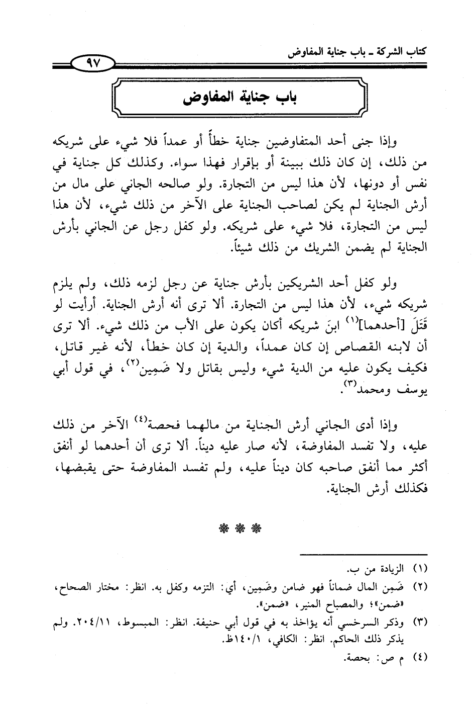 وإذا أدى الجاني أرش الجناية من مالهما فحصة (¬4) الآخر من ذلك عليه، ولا تفسد المفاوضة، لأنه صار عليه ديناً. ألا ترى أن أحدهما لو أنفق أكثر مما أنفق صاحبه كان ديناً عليه، ولم تفسد المفاوضة حتى يقبضها، فكذلك أرش الجناية.