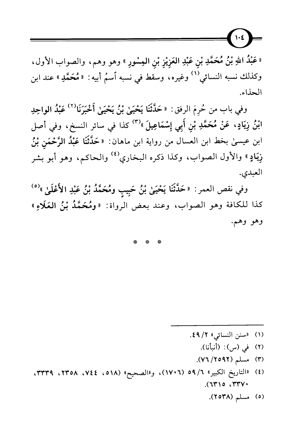 "عَبْدُ اللهِ بْنُ مُحَمَّدِ بْنِ عَبْدِ العَزِيْزِ بْنِ المِسْورِ" وهو وهم، والصواب الأول، وكذلك نسبه النسائي (¬1) وغيره، وسقط في نسبه اسمُ أبيه: "مُحَمَّدِ" عند ابن الحذاء.