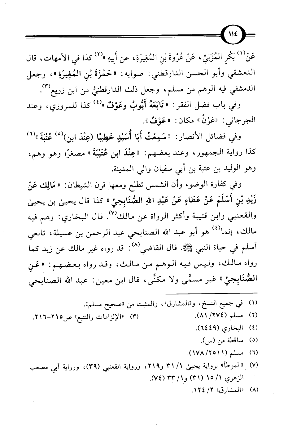 وفي كفارة الوضوء وأن الشمس تطلع ومعها قرن الشيطان: "مَالِك عَنْ زَيْدِ بْنِ أَسْلَمَ عَنْ عَطَاءٍ عَنْ عَبْدِ اللهِ الصُّنَابِحِيِّ" كذا قال يحيى بن يحيى والقعنبي وابن قتيبة وأكثر الرواة عن مالك (¬7). قال البخاري: وهم فيه مالك، إنما (4) هو أبو عبد الله الصنابحي عبد الرحمن بن عسيلة، تابعي أسلم في حياة النبي - صلى الله عليه وسلم -.قال القاضي (¬8): قد رواه غير مالك عن زيد كما رواه مالك، وليس فيه الوهم من مالك، وقد رواه بعضهم: "عَنِ الصُّنَابِحِيِّ" غير مسمًّى ولا مكنًّى، قال ابن معين: عبد الله الصنابحي