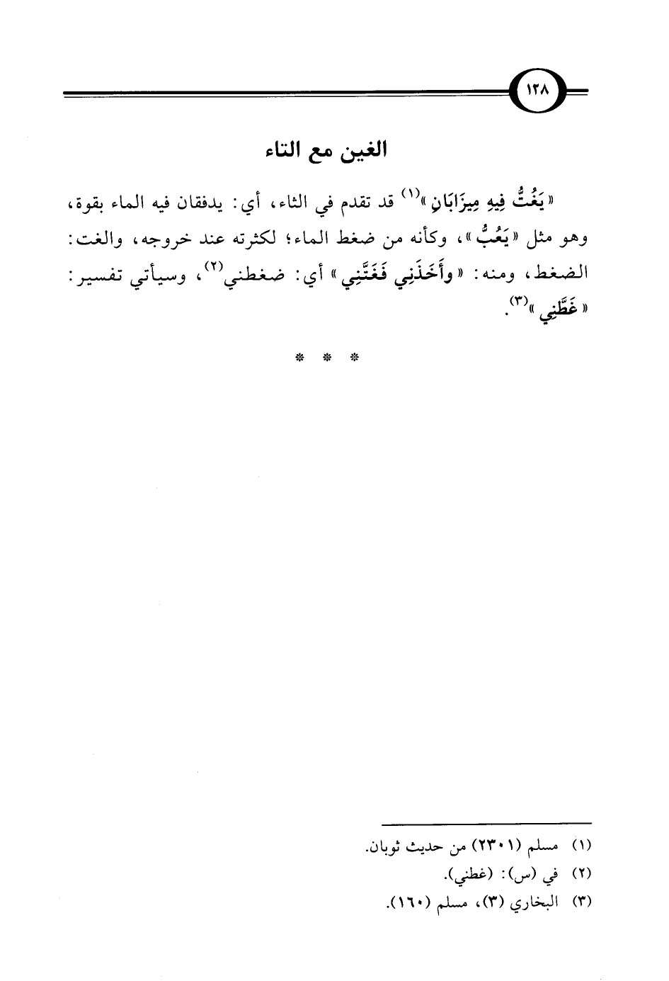 " يَغُتُّ فِيهِ مِيزَابَانِ" (¬1) قد تقدم في الثاء، أي: يدفقان فيه الماء بقوة، وهو مثل "يَعُبُّ"، وكأنه من ضغط الماء؛ لكثرته عند خروجه، والغت: الضغط، ومنه: "وأَخَذَنِي فَغَتَّنِي" أي: ضغطني (¬2)، وسيأتي تفسير: "غَطَّنِي" (¬3).
