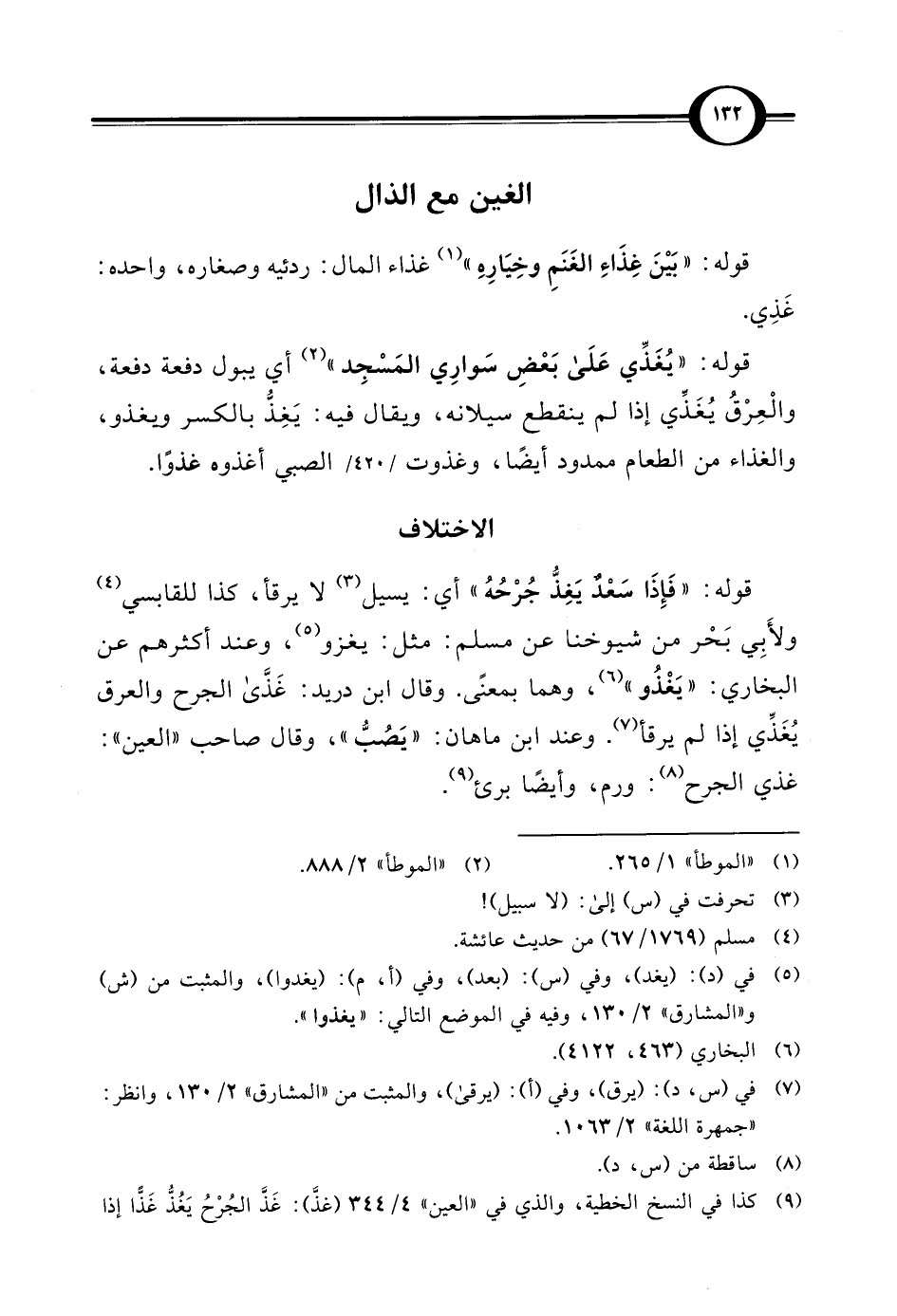 قوله: "يُغَذِّي عَلَى بَعْضِ سَوارِي المَسْجِد" (¬2) أي يبول دفعة دفعة، والْعِرْقُ يُغَذِّي إذا لم ينقطع سيلانه، ويقال في: يَغِذُّ بالكسر ويغذو، والغذاء من الطعام ممدود أيضًا، وغذوت الصبي أغذوه غذوًا.