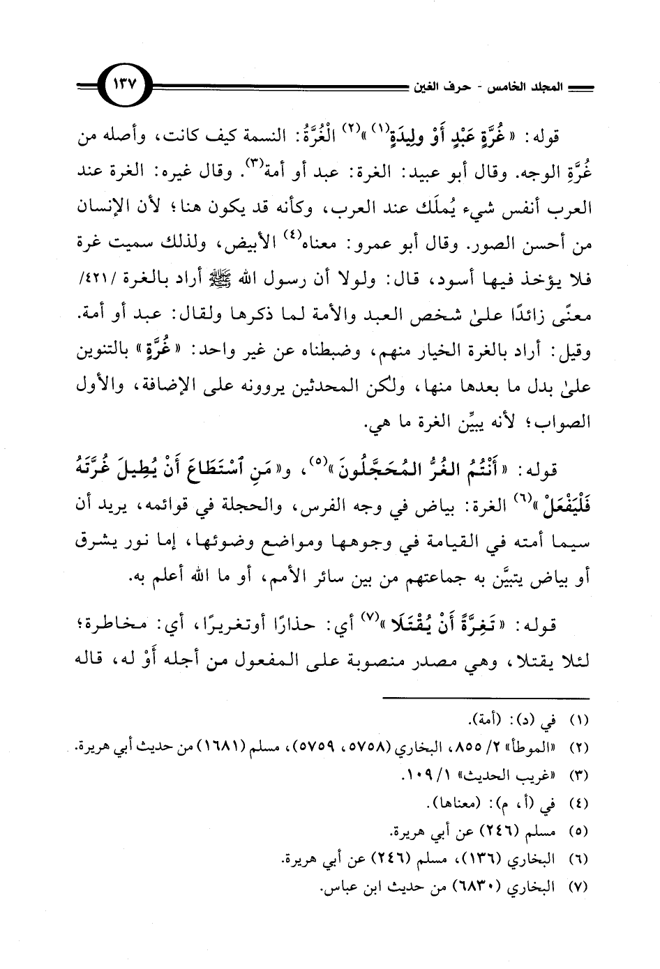 قوله: "أَنْتُمُ الغُرُّ المُحَجَّلُونَ" (¬5)، و"مَنِ استَطَاعَ أَنْ يُطِيلَ غُرَّتَهُ فَلْيَفْعَلْ" (¬6) الغرة: بياض في وجه الفرس، والحجلة في قوائمه، يريد أن سيما أمته في القيامة في وجوهها ومواضع وضوئها، إما نور يشرق أو بياض يتبيَّن به جماعتهم من بين سائر الأمم، أو ما الله أعلم به.