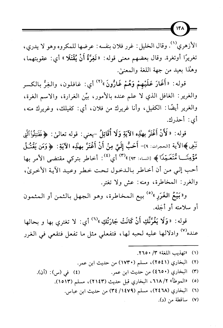 الأزهري (¬1). وقال الخليل: غرر فلان بنفسه: عرضها للمكروه وهو لا يدري، تغريرًا أو تغرة. وقال بعضهم معنى قوله: "تَغِرَّةً أَنْ يُقْتَلا" أي: عقوبتهما، وهذا بعيد من جهة اللغة والمعنى.