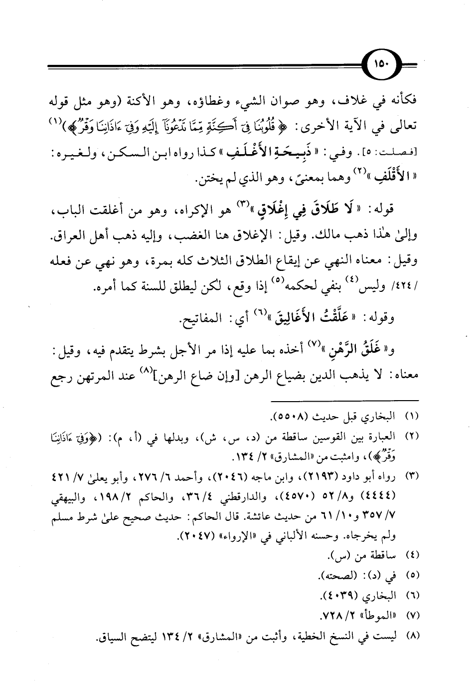 فكأنه في غلاف، وهو صوان الشيء وغطاؤه، وهو الأكنة (وهو مثل قوله تعالى في الآية الأخرى: {قُلُوبُنَا فِي أَكِنَّةٍ مِمَّا تَدْعُونَا إِلَيْهِ وَفِي آذَانِنَا وَقْرٌ}) (¬1) [فصلت: 5]. وفي: "ذَبِيحَةِ الأَغْلَفِ" كذا رواه ابن السكن، ولغيره: "الأَقْلَفِ" (¬2) وهما بمعنىً، وهو الذي لم يختن.